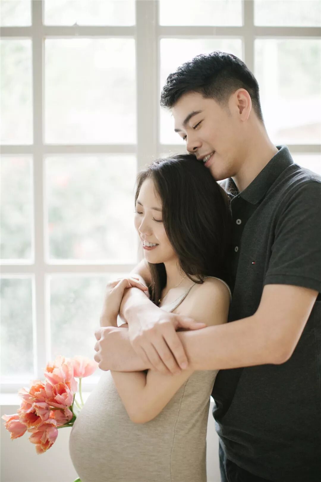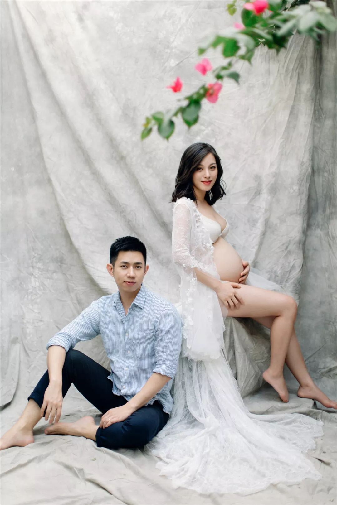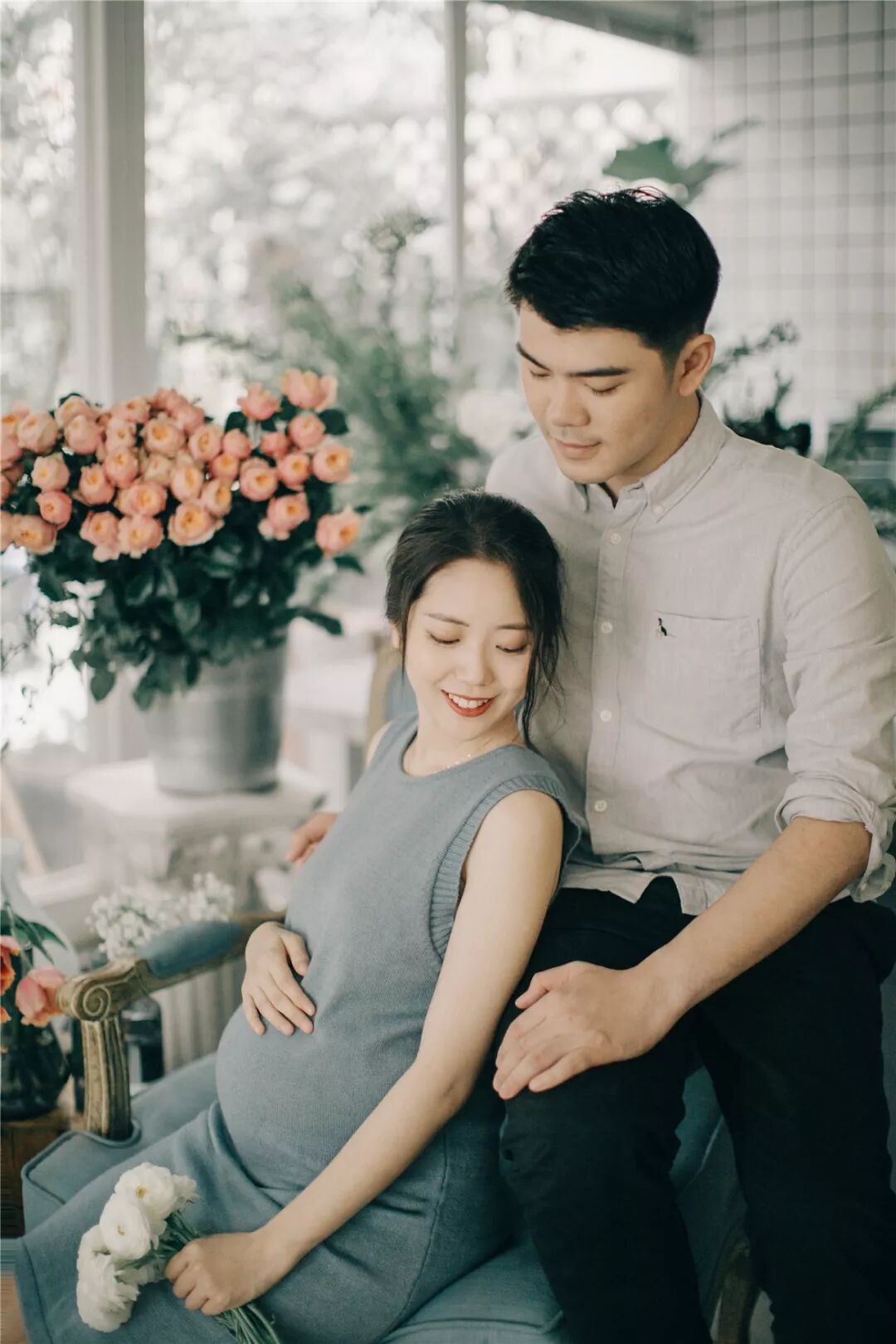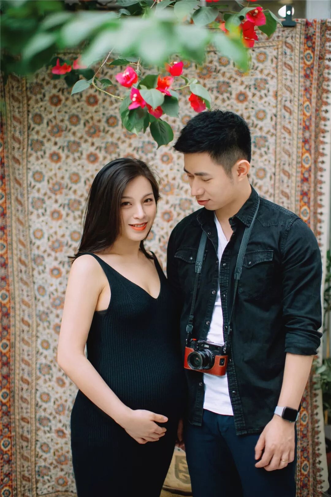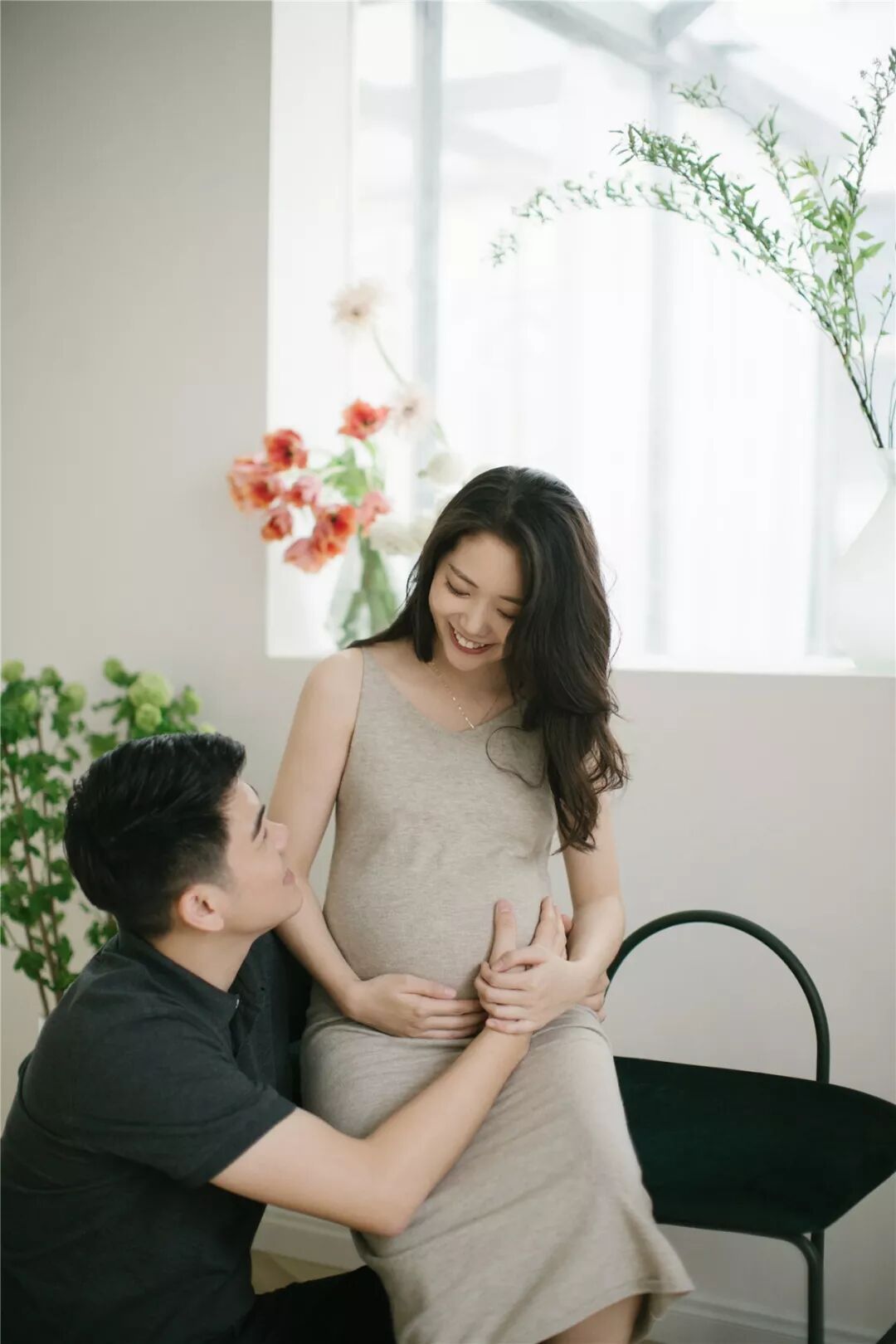 孕照自然也少不了准爸爸的出境,所以男士服装一般建议选择简单百搭的款式,例如衬衣或T恤,尽量跟孕妈的服装颜色相呼应,不要有过于花哨的图案。