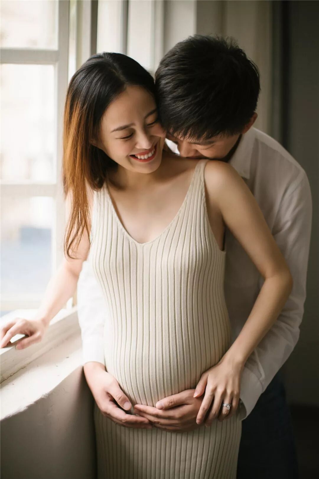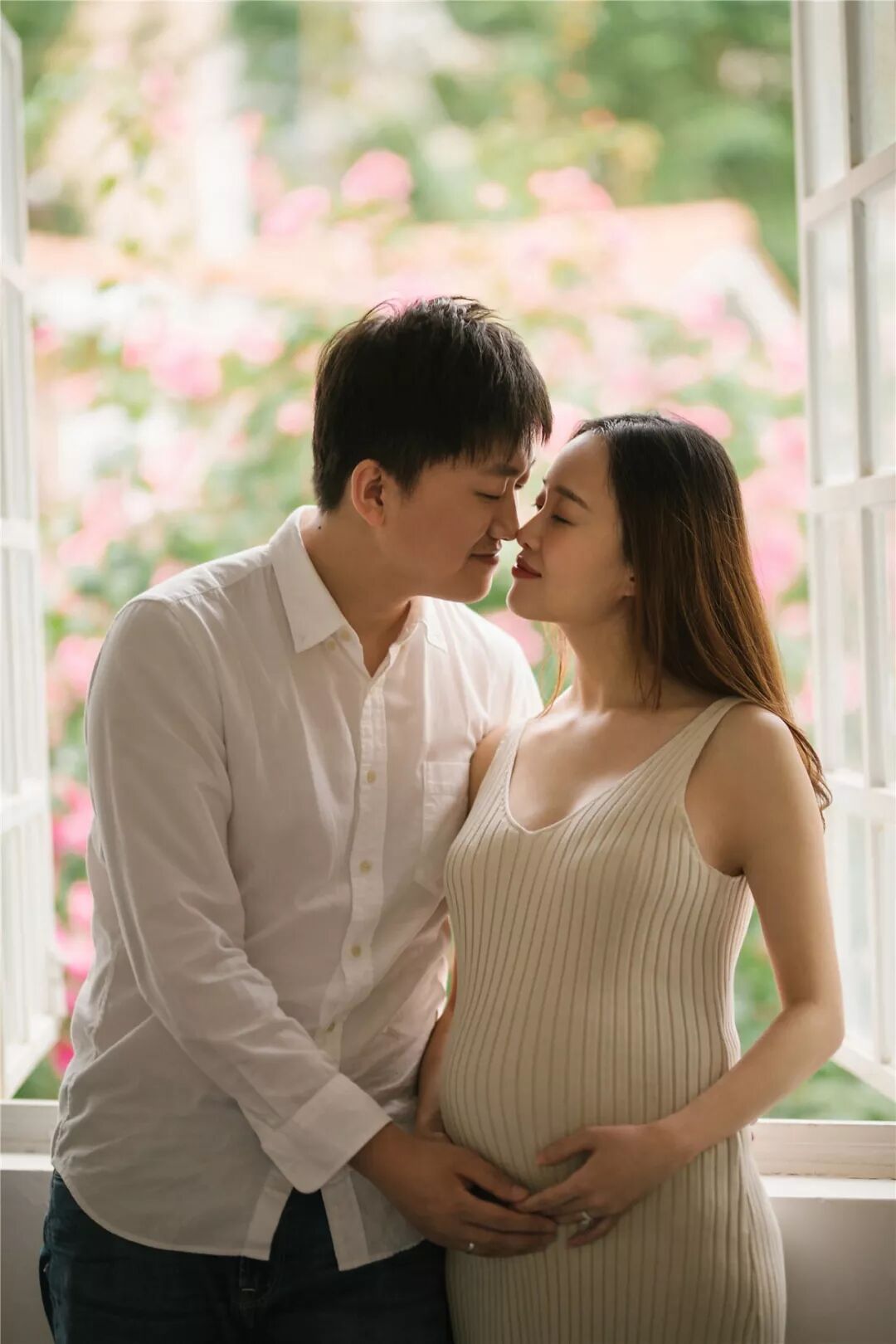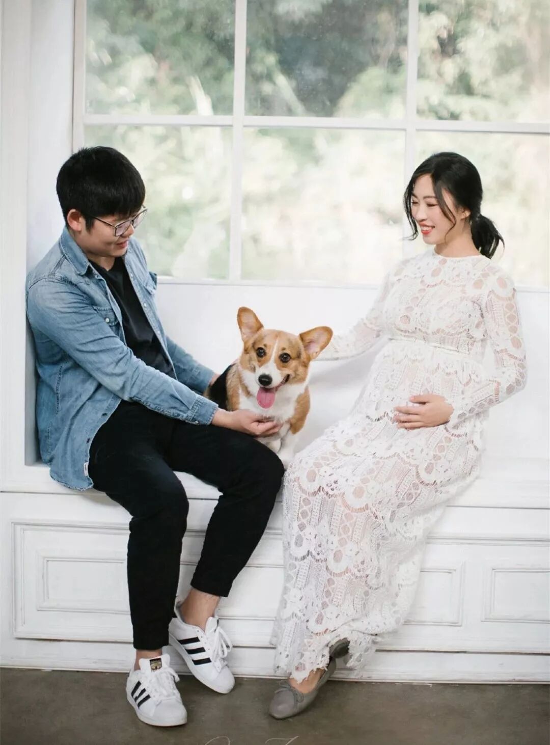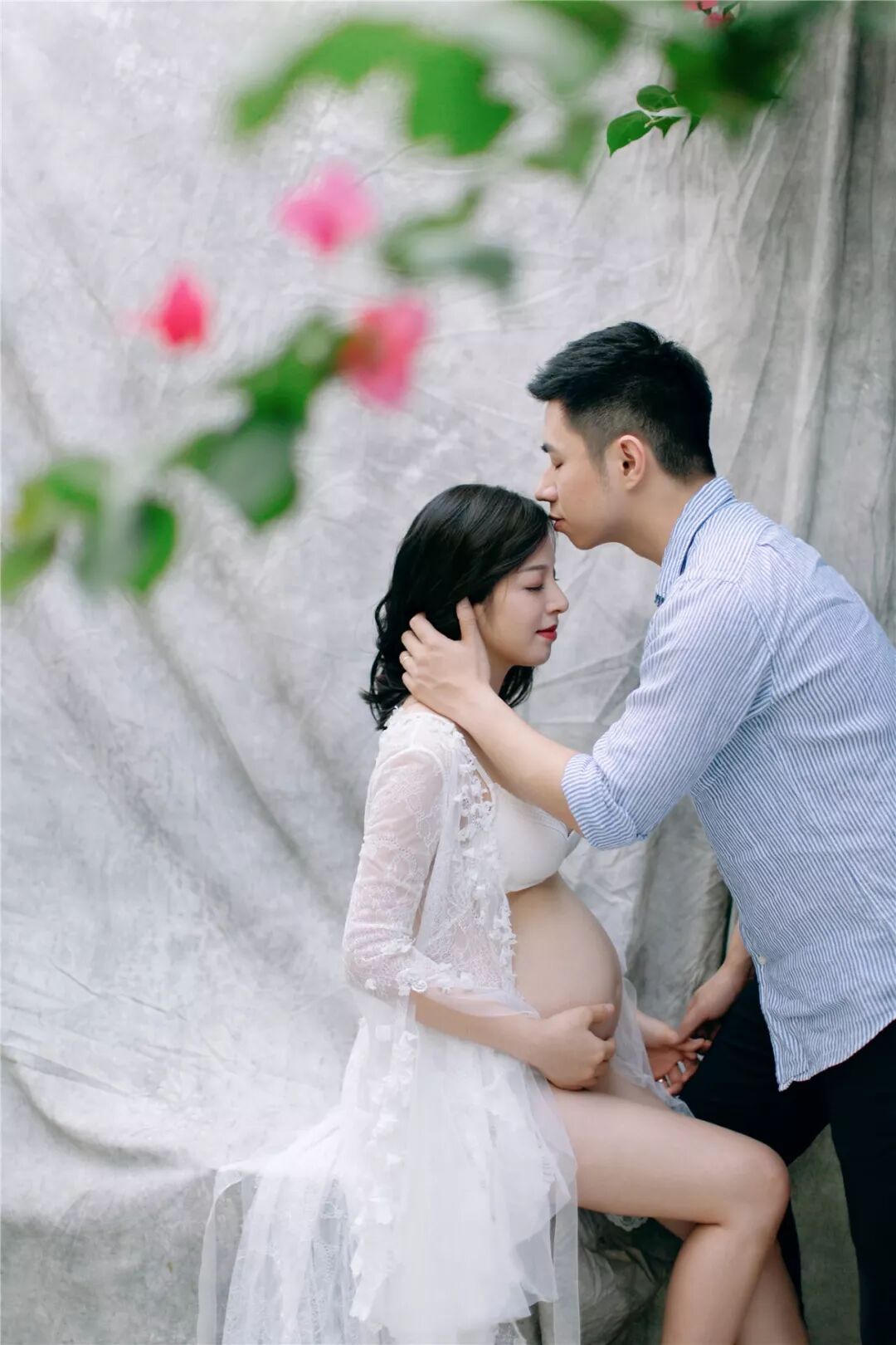 孕照自然也少不了准爸爸的出境,所以男士服装一般建议选择简单百搭的款式,例如衬衣或T恤,尽量跟孕妈的服装颜色相呼应,不要有过于花哨的图案。
