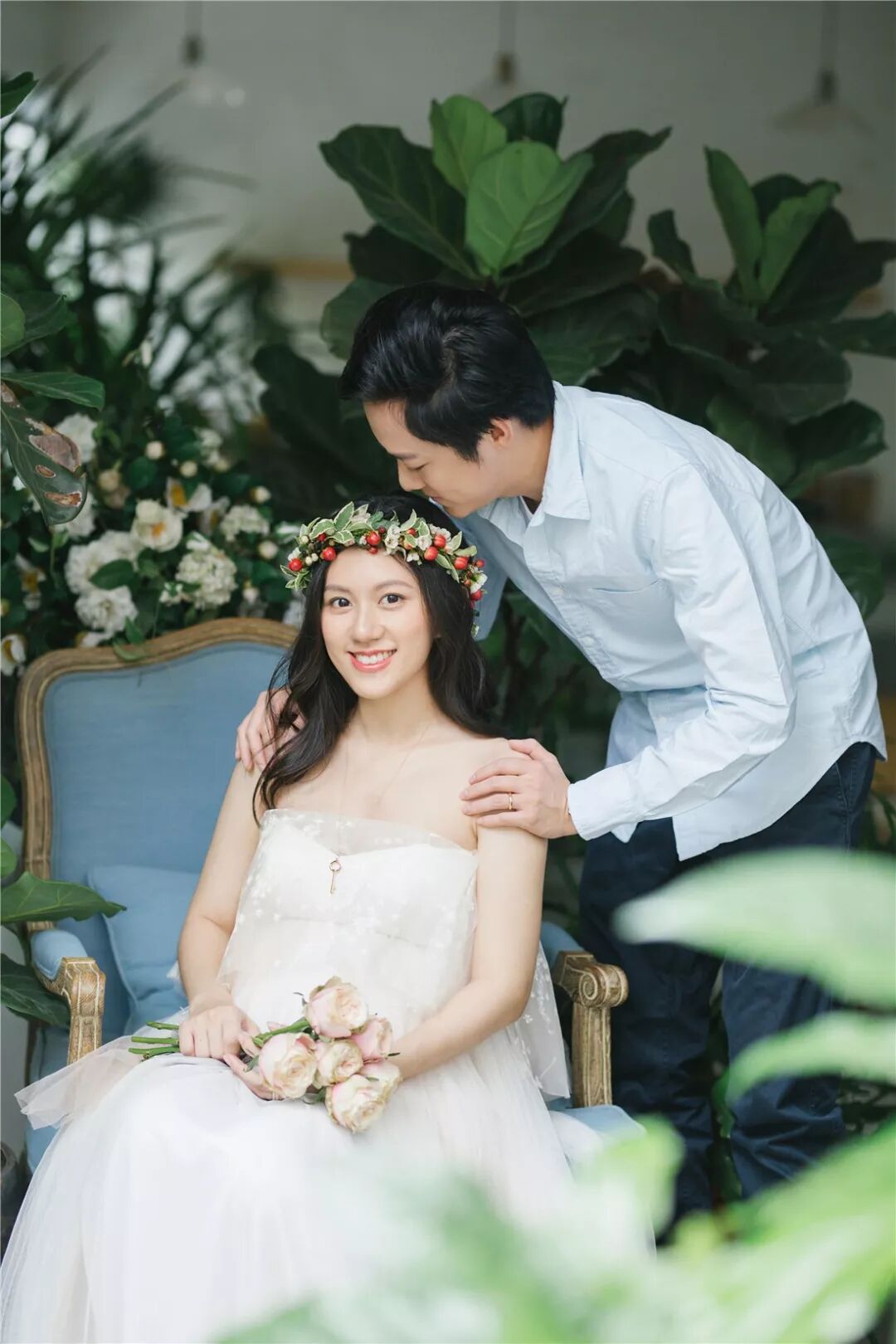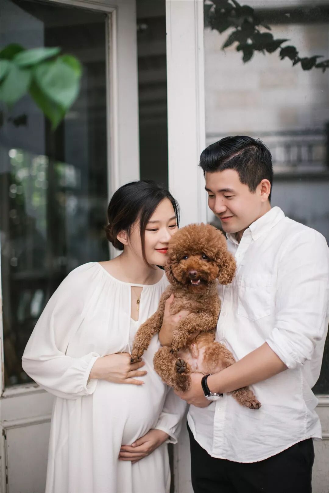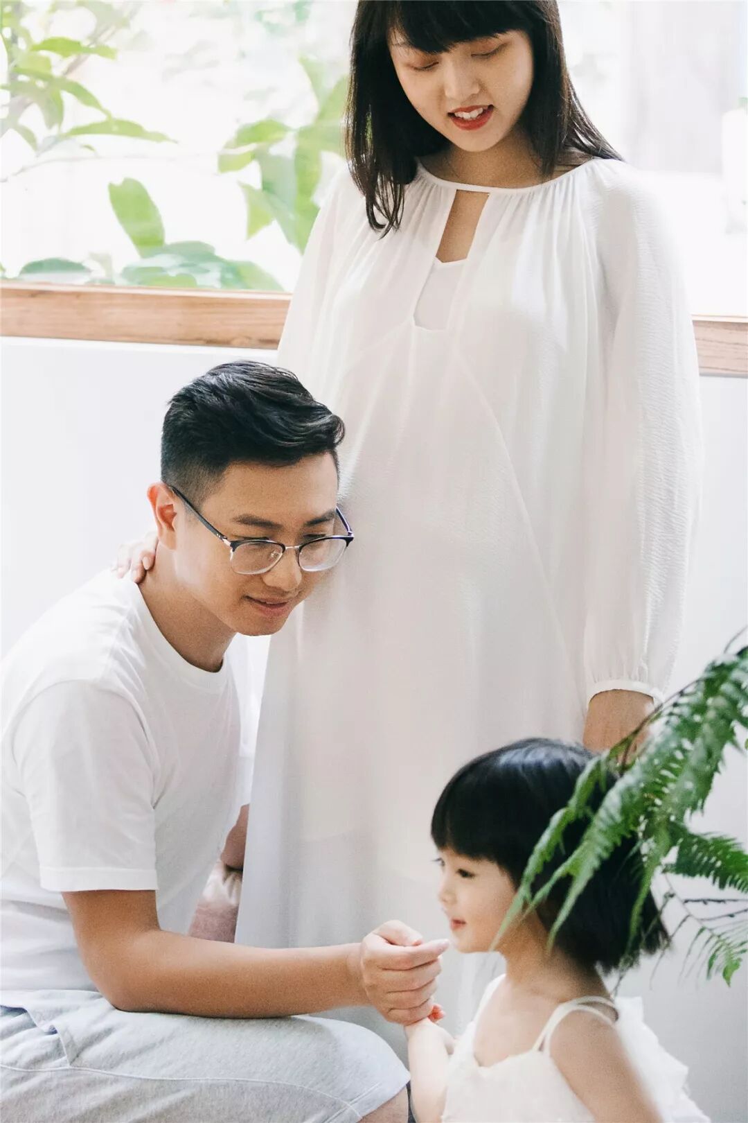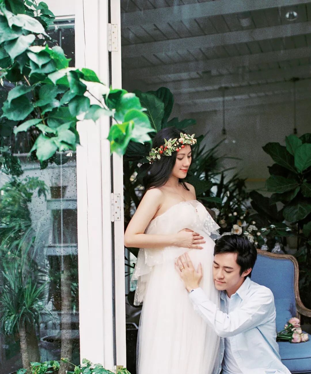 孕照自然也少不了准爸爸的出境,所以男士服装一般建议选择简单百搭的款式,例如衬衣或T恤,尽量跟孕妈的服装颜色相呼应,不要有过于花哨的图案。
