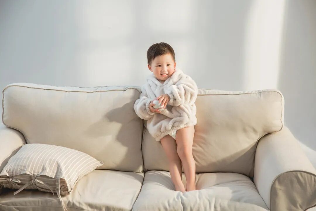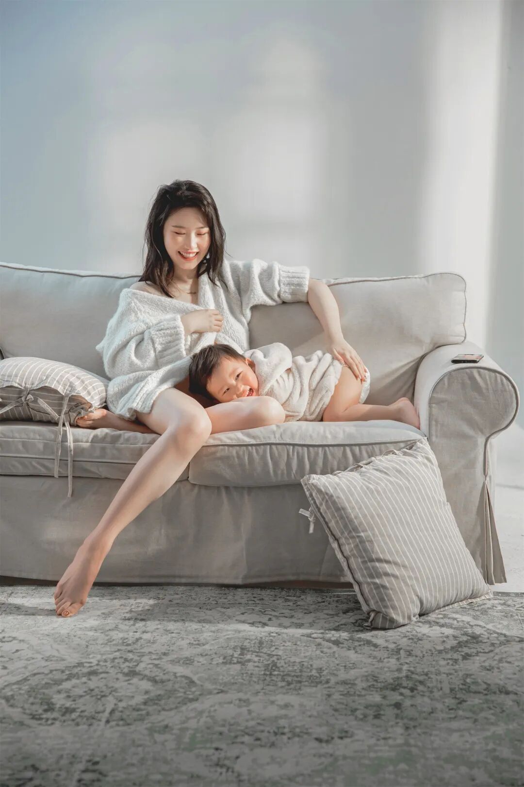 亲子的这组准备了两套服装,一套走的是比较居家温馨的感觉,我穿的是一件毛衣开衫,八戒是毛茸茸套头衫。场景是布艺沙发,两个人都光着腿,八戒就打了块尿不湿。