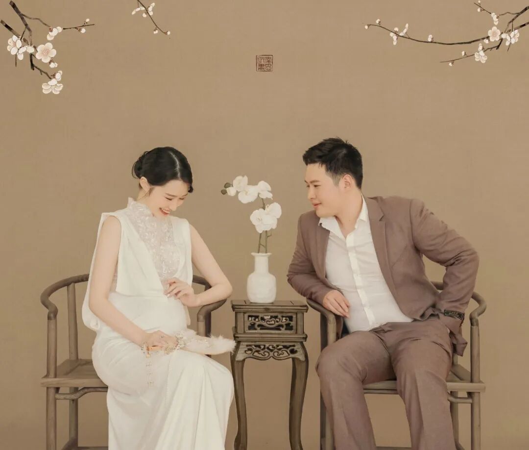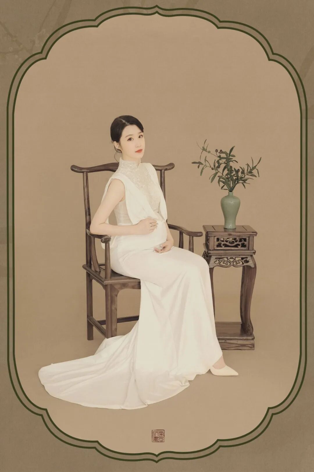 工笔风孕照沿袭了工笔画的风格,但包容性很大,不一定要穿古装,旗袍、新中式礼服、甚至婚纱都是可以驾驭的。我选了一条旗袍领的修身礼服,线条流畅符合工笔画讲究的线条工整。