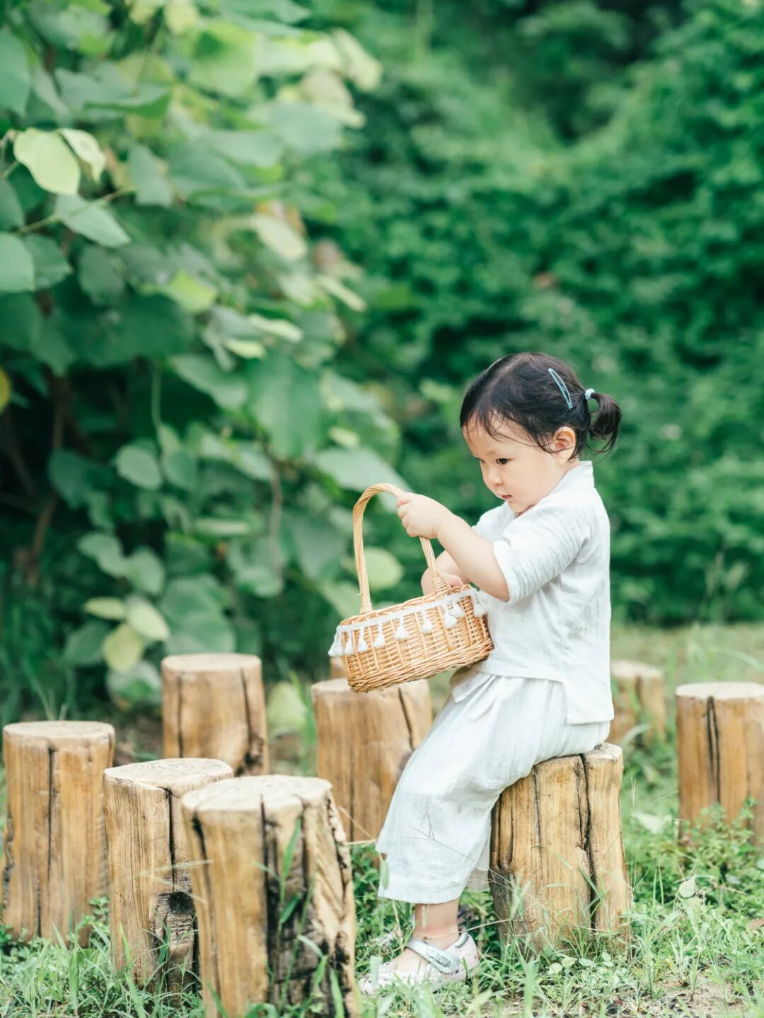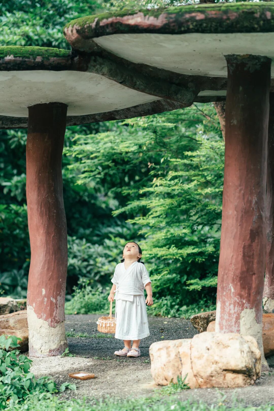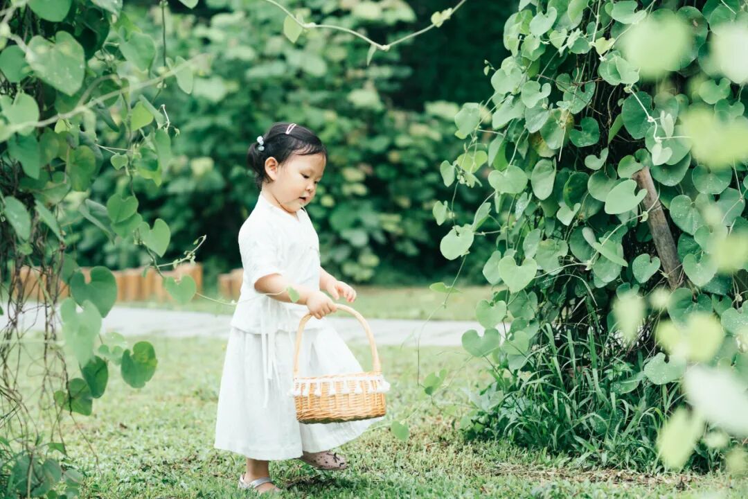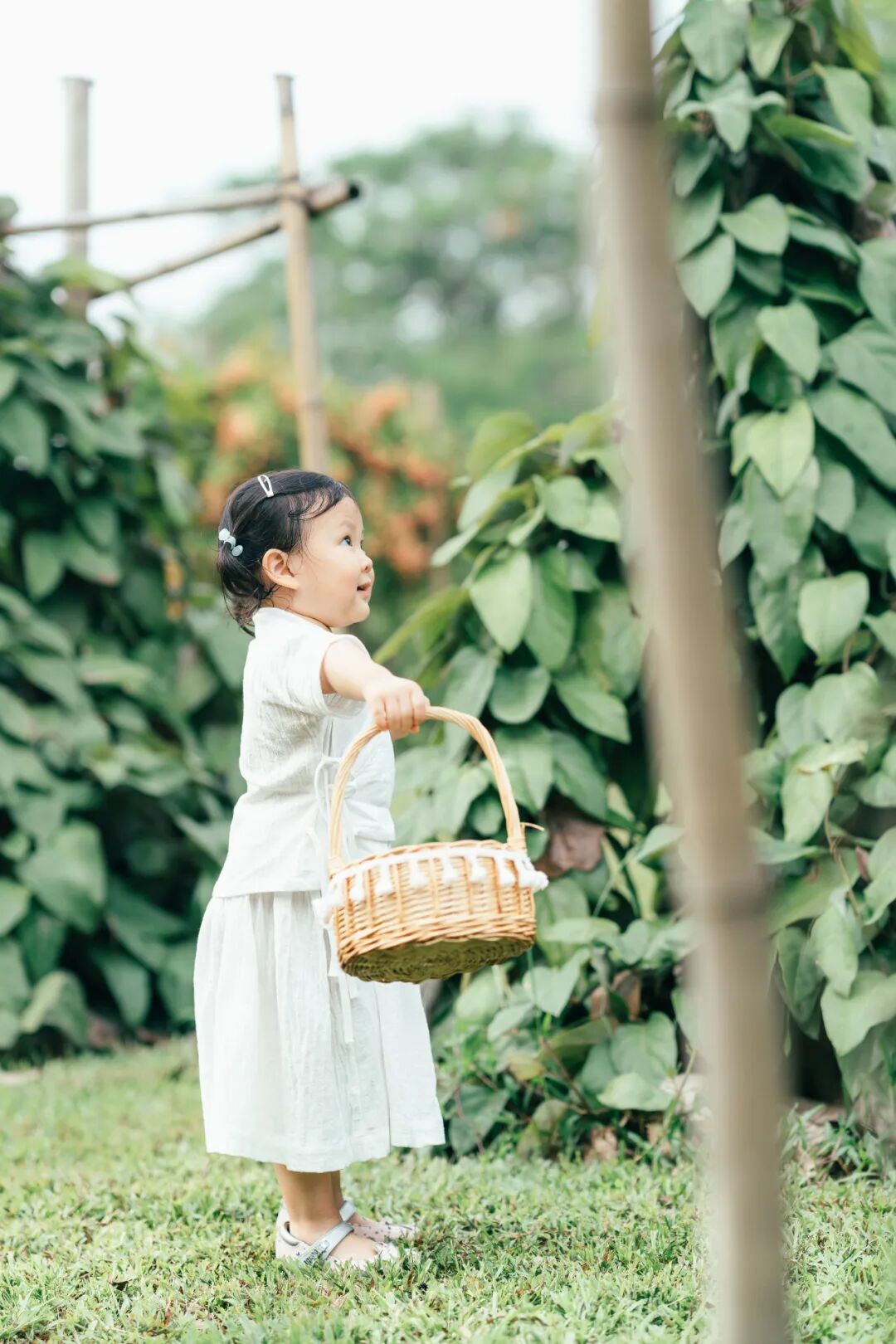 小桃子穿起小裙子,拎起小竹篮,就融入了这个花草藤蔓的世界