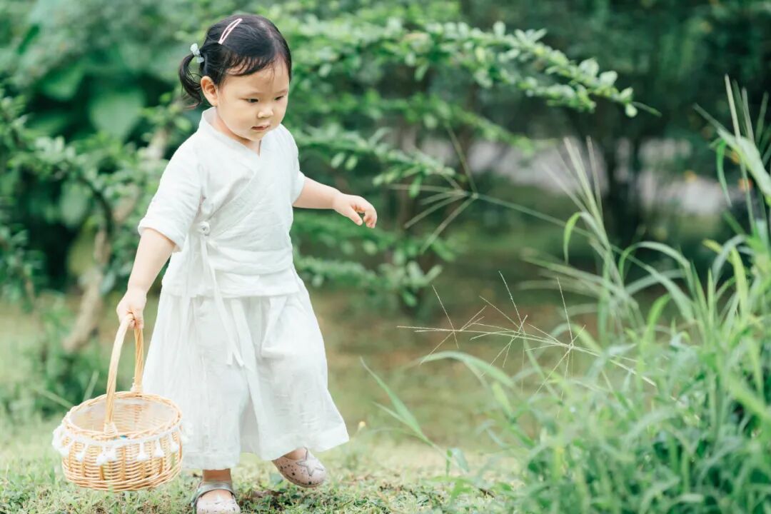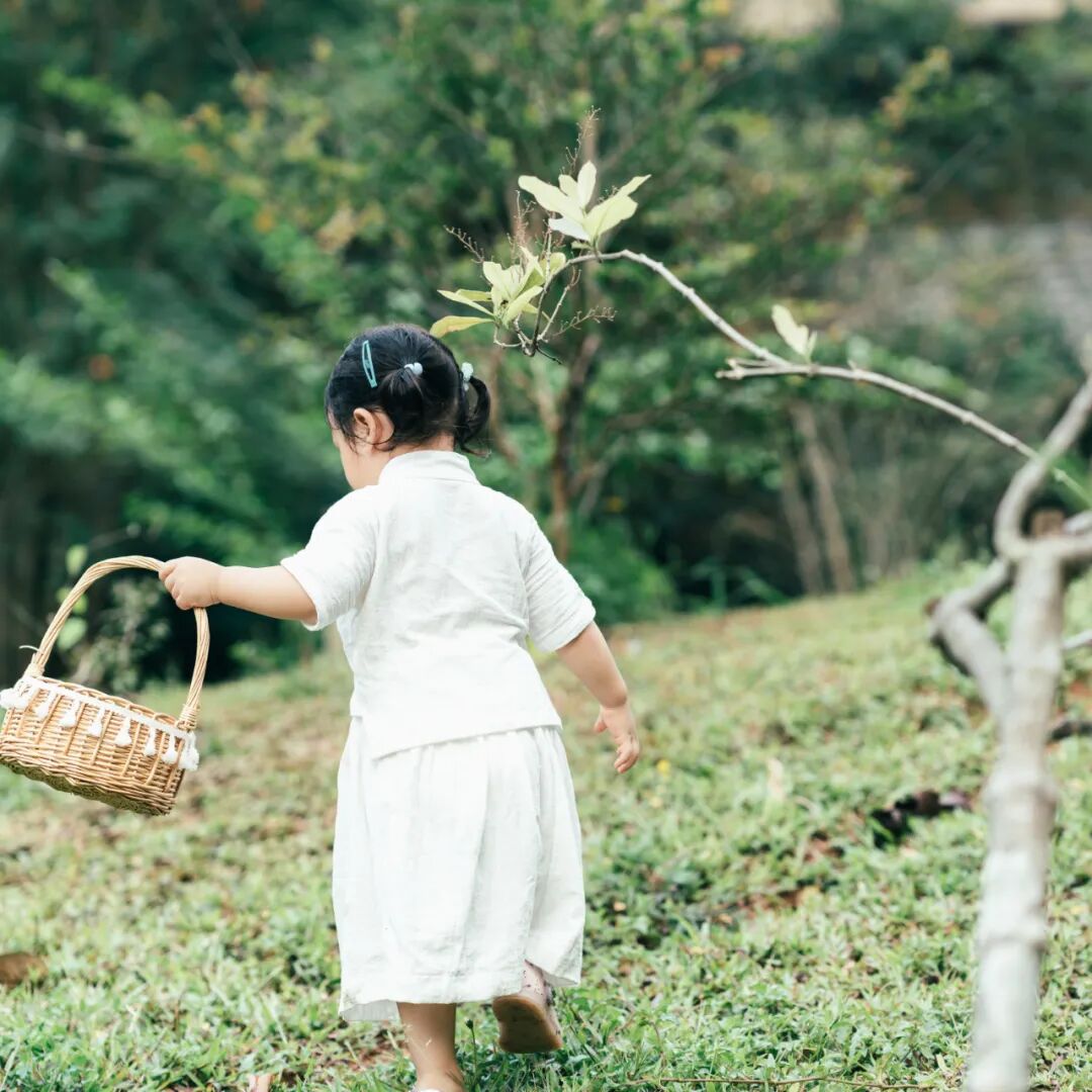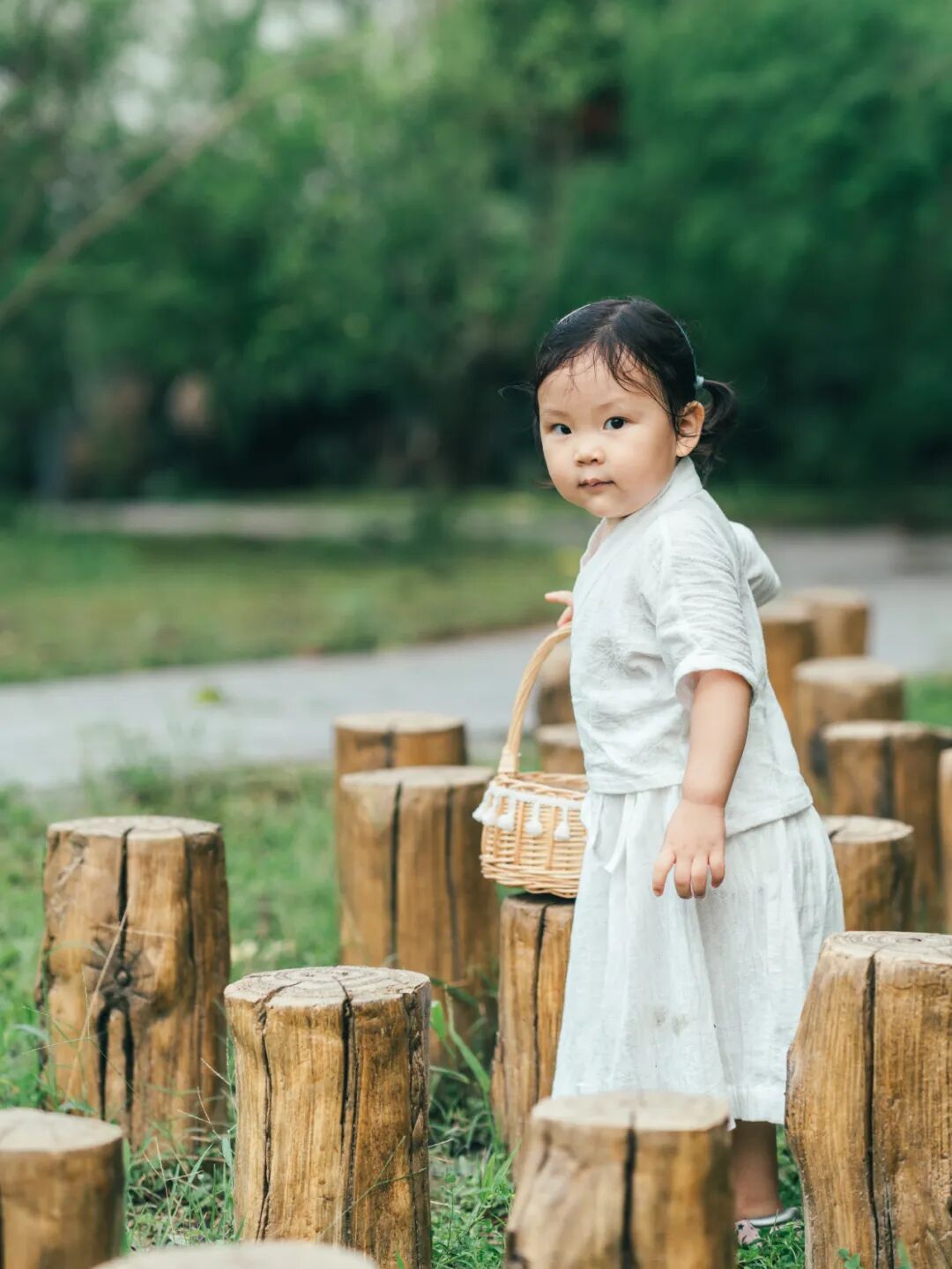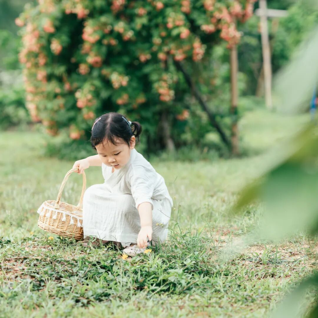 小桃子穿起小裙子,拎起小竹篮,就融入了这个花草藤蔓的世界