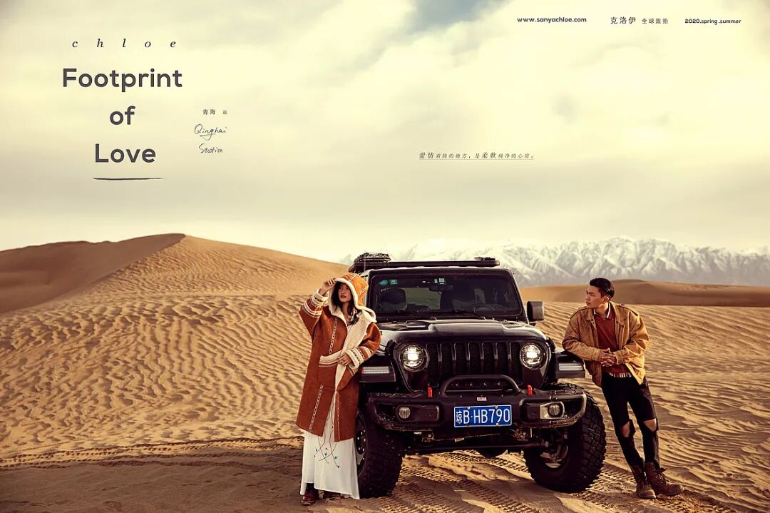 沙漠旅行婚纱照的三要素:背包、吉普车、情侣。