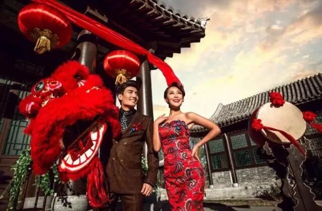 很潮的时尚流行风,如果新娘想让自己的婚纱照个性、富有时代气息,可以选用这种风格,比如流行的“奥运婚纱照”和“中国红”。