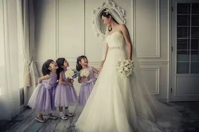 6、一群可爱的小花童围绕着新娘,新娘看着他们露出幸福的笑容,或许,以后,你们也会有这样一个、两个可爱的小孩,绕足膝下。