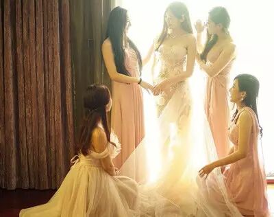 3、伴娘围着你,为你整理裙摆和饰品,而你带着幸福的笑容看着姐妹,还有什么画面比这个更棒的呢!