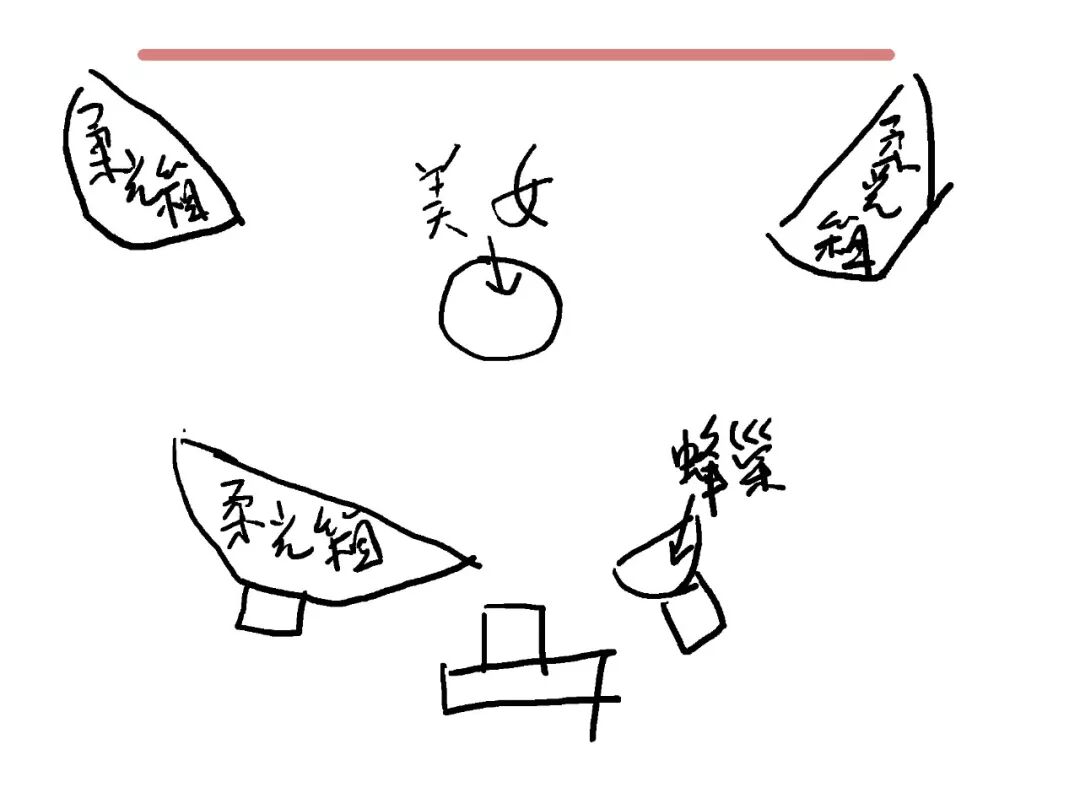 这种布光可以让彩色背景饱和度尽量展现,同时人物又不失质感。