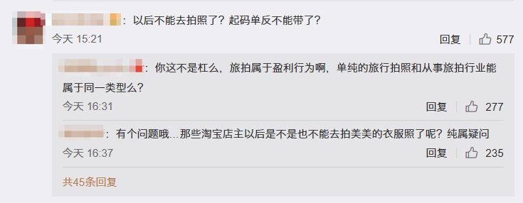 - 在其他国家没出过类似的新闻,也是因为法律法规不一样,比如有的国家大部分地区不禁止商业拍摄;即便禁止,也对商拍有更明确具体的定义(不是穿着婚纱拿着单反就算商拍);