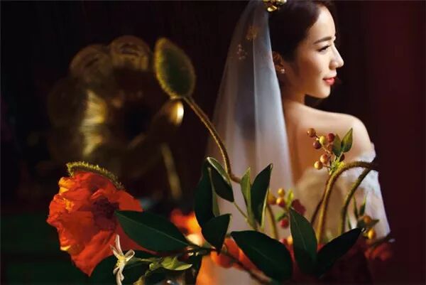 △ 画面右侧是一扇窗户,那天阳光明媚,让新娘站在窗前,以人物面部为基准正常曝光,室内的环境自然被压得很暗。为了增加画面的美感和趣味性,我用一支色温在2900k左右的手电筒打亮近景处的花瓶,并使用移轴镜头拍摄,调整焦平面,使人物和花同时清晰,近处暖调的花朵与远处自然的人物相得益彰。