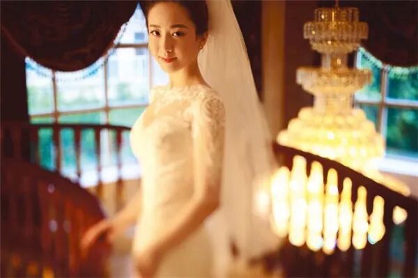 △ 新娘站在家里的楼梯上,大大的吊灯是屋内的主光源,我利用闪光灯加橙色片从图的左侧远处照向新娘,为的是让人物肤色接近环境光,侧光可强化人物的五官轮廓,偏暖的肤色与吊灯呈现的色彩接近,营造出一种暖色光环境下的唯美肖像。室内光源色温在3200k,与室外5500k的日光环境形成冷暖对比。