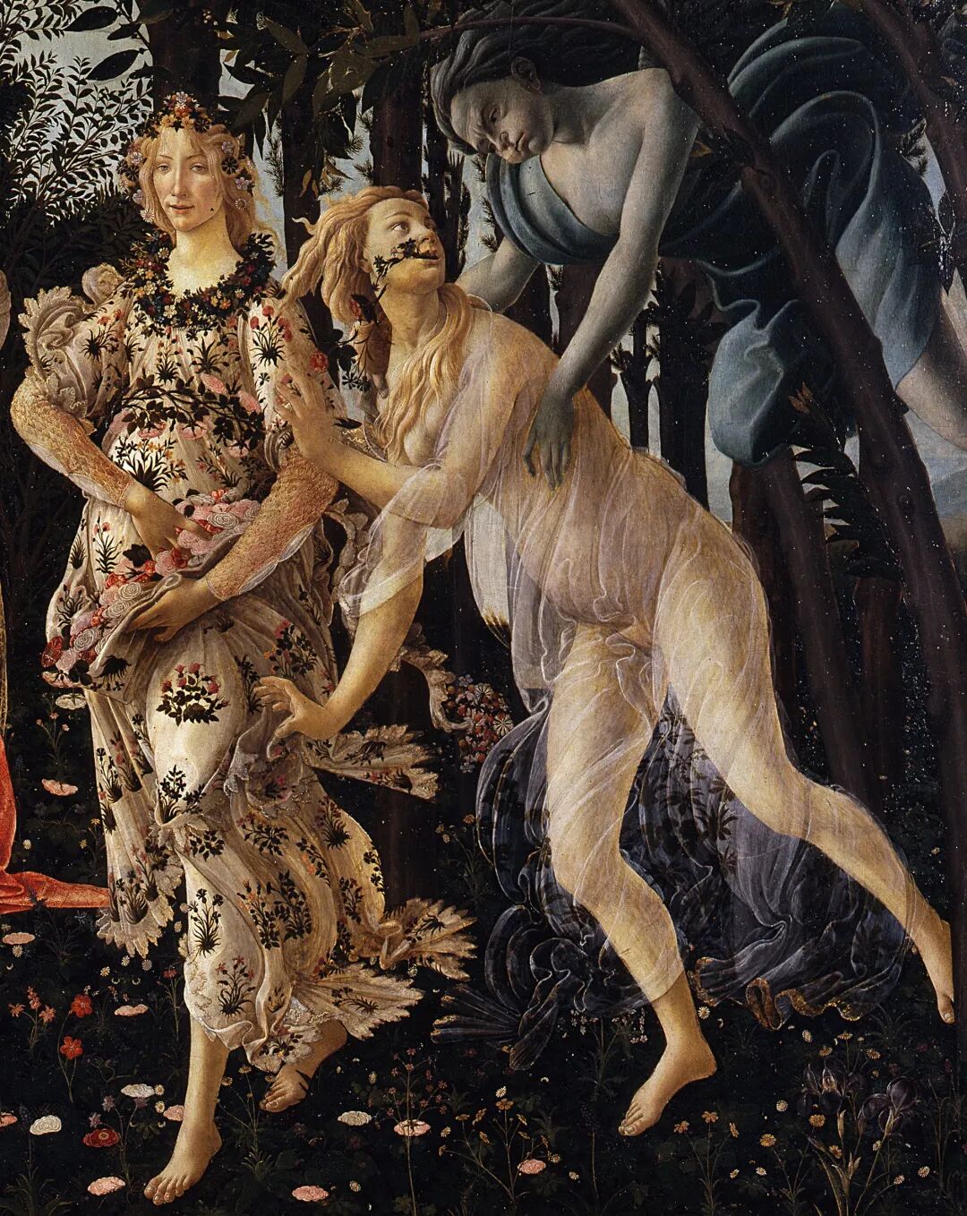 画面右侧首先出现的,是一个带翅膀的蓝色男子,他怒目圆睁,正将他面前的女子一把抓住。正在努力挣脱的女子身着素色轻纱,在她旁边,是一位身着满是花朵的华丽服饰的少妇,正面带微笑地看着画外的观众。这三个人物,出自古罗马诗人奥维德的作品《岁时记》。这一段讲述的是古罗马版的春回大地,花草盛开的故事。蓝色男子是西风之神泽费罗斯,他夺去了大地上尚未绽放的仙女克洛里斯的处子之身,使其变为更具风韵的花神佛洛拉。