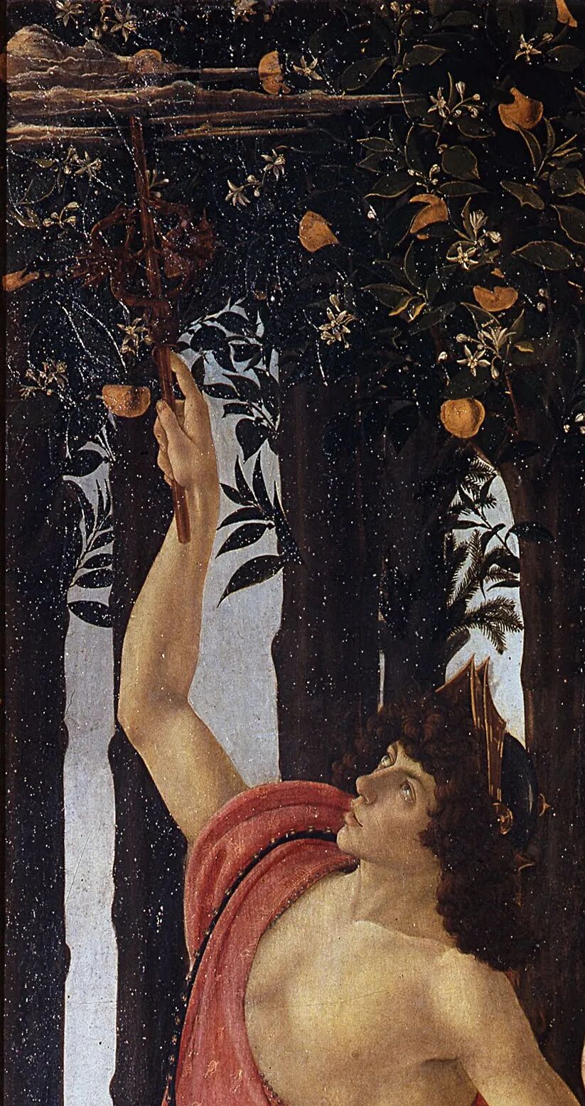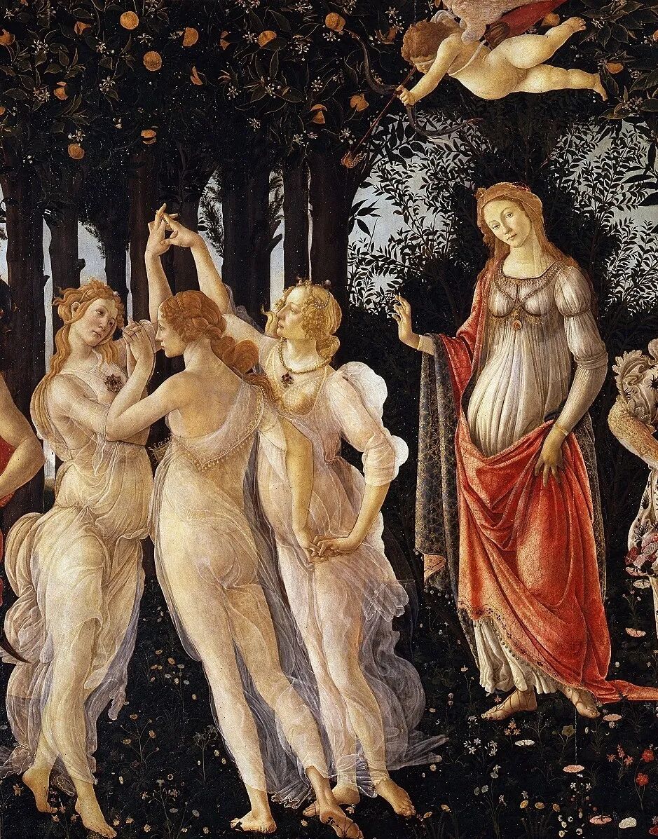所以,正确观看这幅画的方式应该是从右至左:西风神泽费罗斯抓住仙女克洛里斯,强迫她成为自己新娘。这一过程虽然可能并非自由恋爱的产物,但其结果将是喜人的:经过了婚姻的结合,克洛里斯成为了更富魅力的花神佛洛拉,并为整个树林带来了丰硕的果实。并且,这样的一桩婚事,将会在爱神维纳斯的庇护下,日久生情,像美惠三女神所象征的那样充满美好。即便有潜在的危机,冷风让一切凋零,也将被墨丘利巧妙化解。
