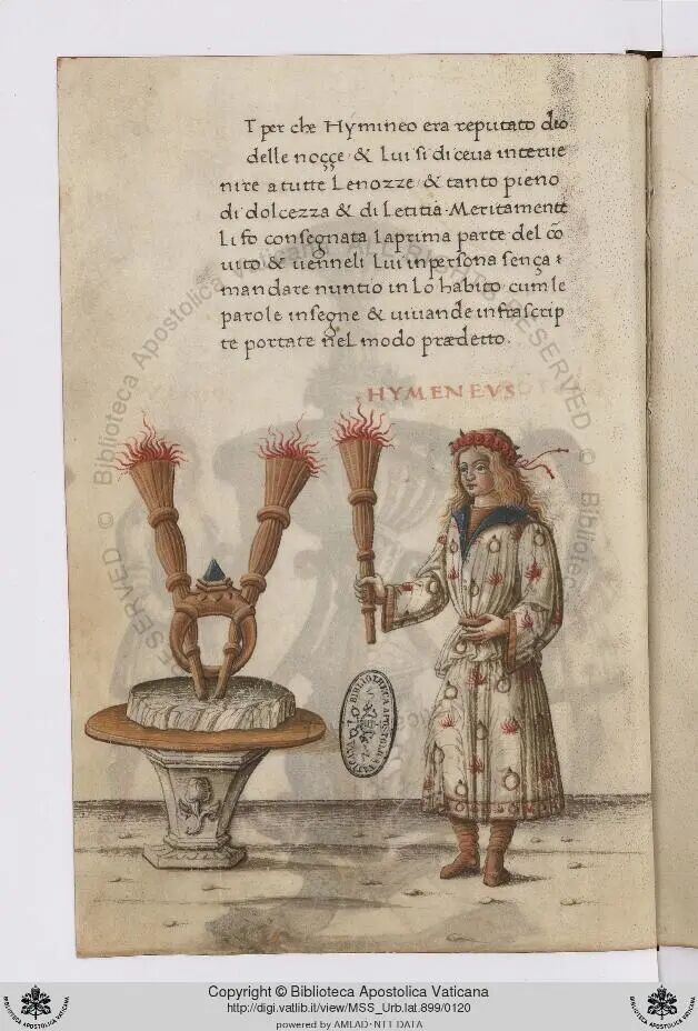 16世纪初,罗马人马可·安东尼奥·阿尔铁里写了本名叫《婚礼》的书,详细写到了一场体面的婚礼所应包含的流程。首先,在婚礼开始之前,双方亲家要对嫁妆的内容达成一致。随后,仪式正式开始,新娘的父亲把女儿交给新郎。接下来,主婚人会手持一柄剑,摆在新人的头上方,与此同时,两位新人对彼此表达爱意和承诺。