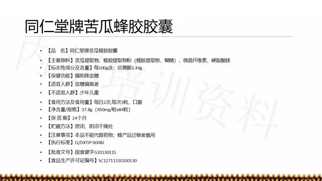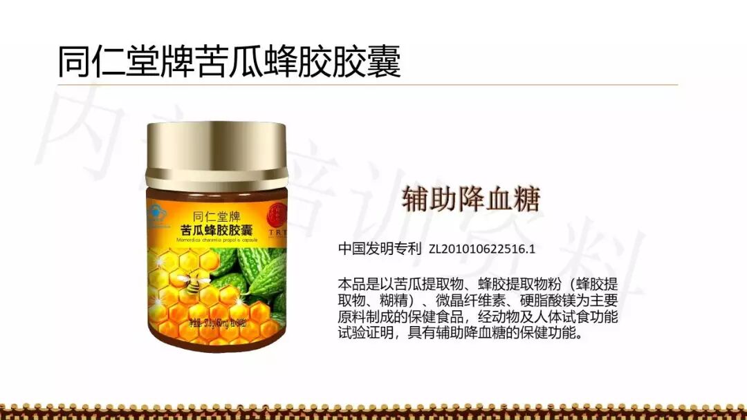 同仁堂健康苦瓜蜂胶胶囊里面有两个原料,一个是苦瓜,另一个是蜂胶。苦瓜我们都知道,很多高血糖的人群,糖尿病的人群的病人去看大夫的时候,大夫一般都会跟他说,你平时除了吃药之外,多吃点苦瓜,对降血糖有效果。经过现代研究发现,苦瓜当中的一些有效成分可以帮助我们降低小肠对葡萄糖的吸收,血液中的糖是从哪来的?是我们每天吃饭、消化,通过小肠运输到血液中去的,如果我们阻止糖分在小肠中的吸收,它就到不了我们的血液里,这时候血糖就会得到很好的控制,而苦瓜中的有效成分就可以帮助我们降低小肠对糖分的吸收,来帮助我们控制血糖。