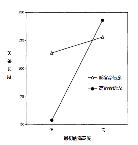 对于宿命信念的人来说,最初的满意度能够显著预测恋爱长度;而对成长信念的人来说,最初的满意度跟恋爱长度关系不大。
