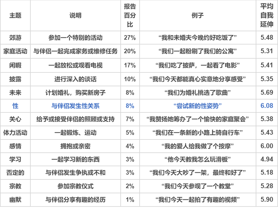 伴侣之间进行新奇、令人兴奋的活动,可以激发更高的性欲,反之也更大程度地增强自我延伸。