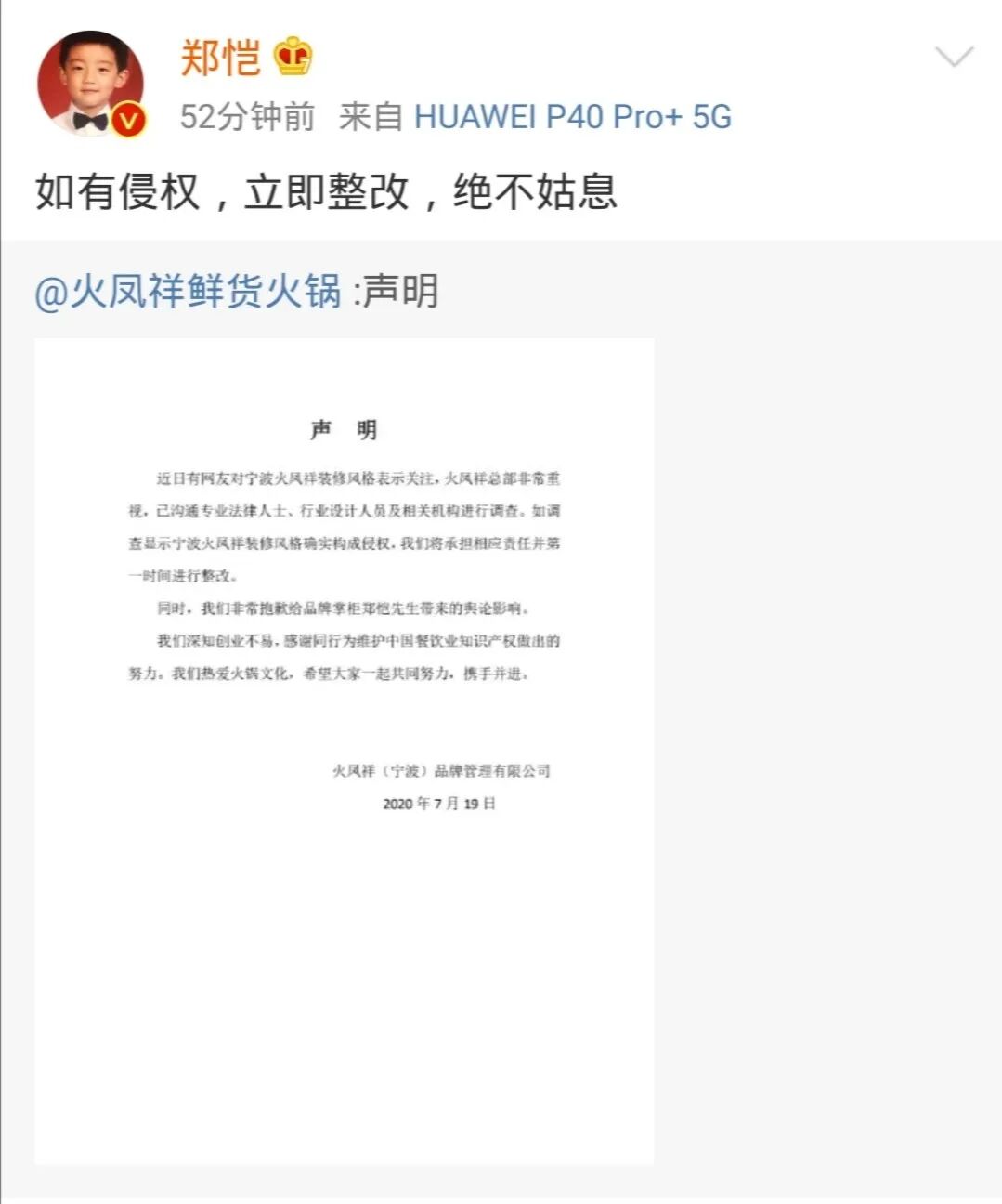郑恺在第一时间便发布了微博称,如有侵权将立即整改,绝不姑息!