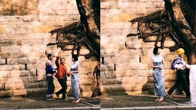 一位身着旗袍的模特站在城墙下,一群民工迎面走过来,意识到误入镜头,他们迈着欢快的小碎步,对着镜头不好意思地挥挥手,迅速走出了镜头。