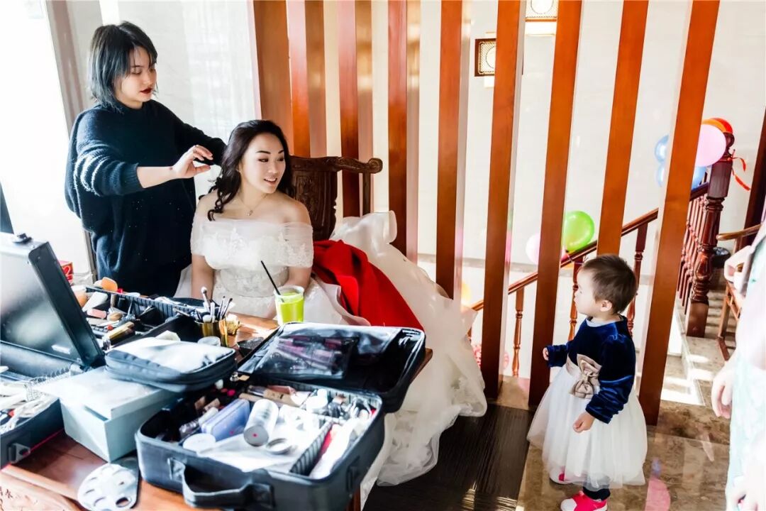 我当天约的7点上门化妆,结果所有人都到了,我还在床上没有起来。双儿(我的造型师)第一次见到这么不着急的新娘。洗漱完了之后,都已经是7:30了。本来定的9点迎亲,到点了我还没倒腾完,只能往后延时。