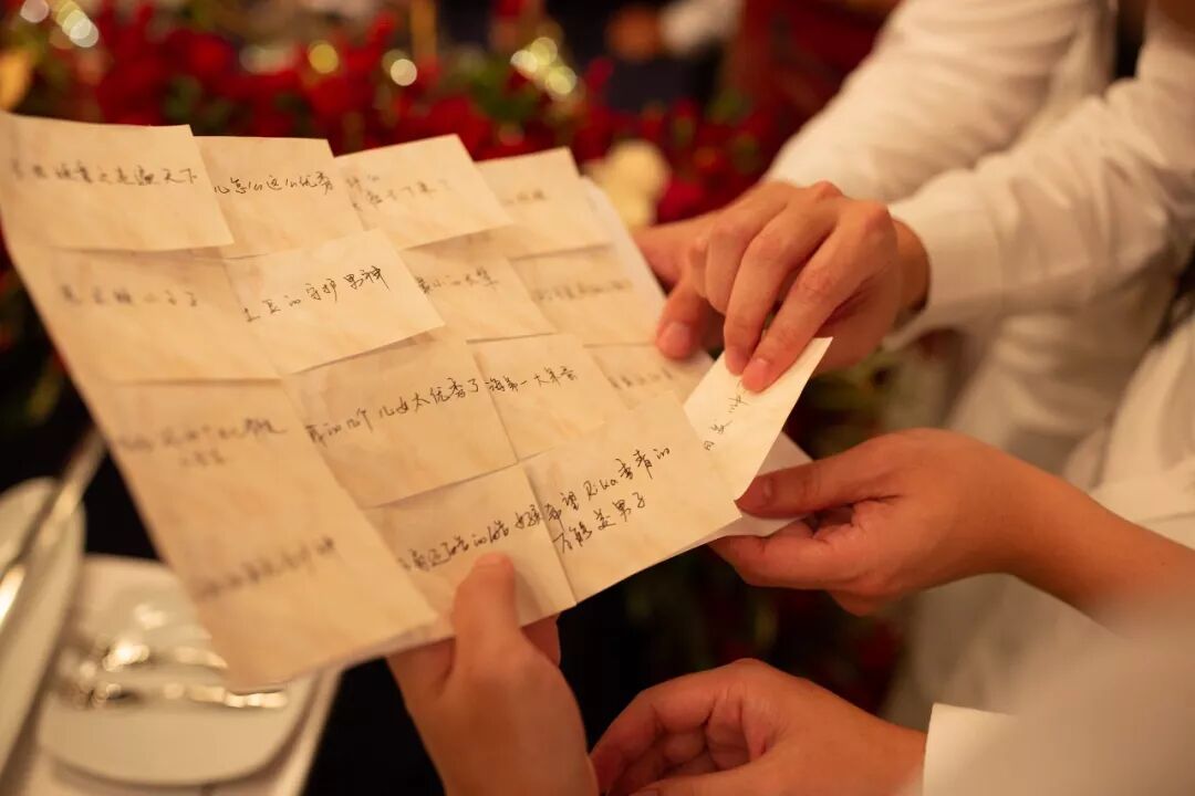 有一个环节叫“每人一卡”,我们提前用一句话写下了对各位宾客的印象,在晚宴开始前,宾客们需要找到认为是形容自己的那张卡片,而主持人会Cue一些人上来谈一谈和新娘或新郎的故事。