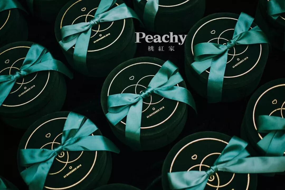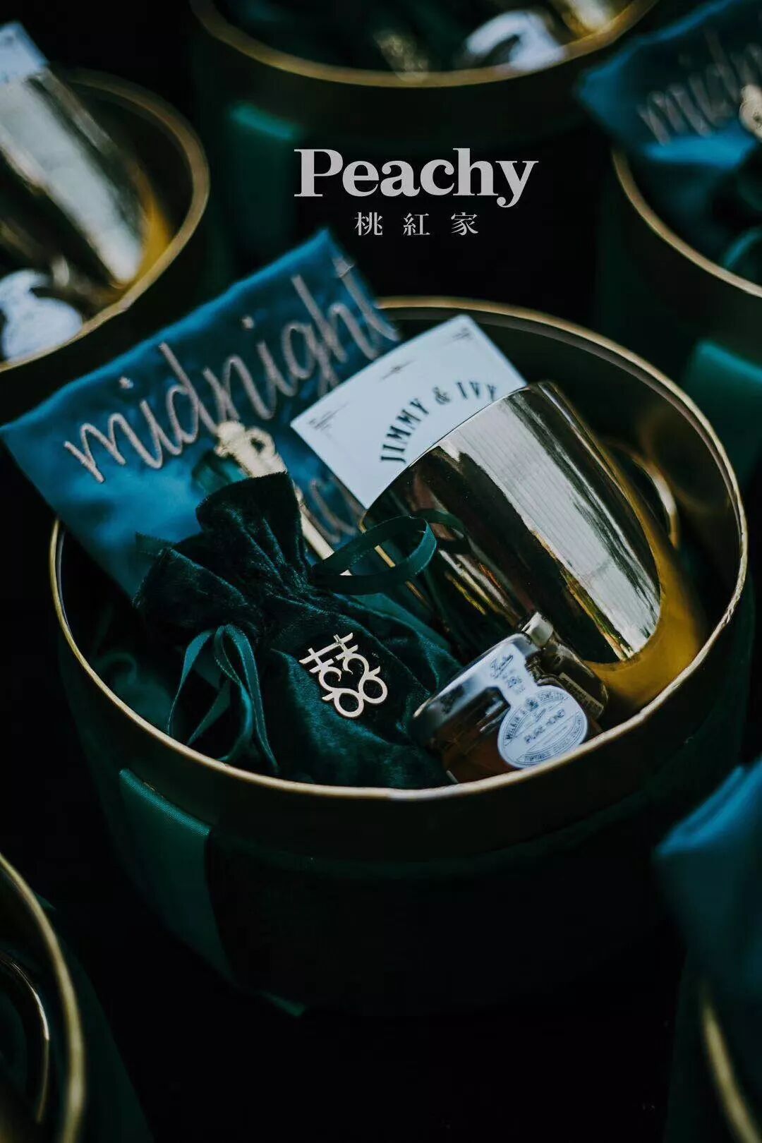 伴手礼来自桃红家,是一个绿丝绒的盒子,盒盖上特别定制了我们的婚礼logo,质感满满。