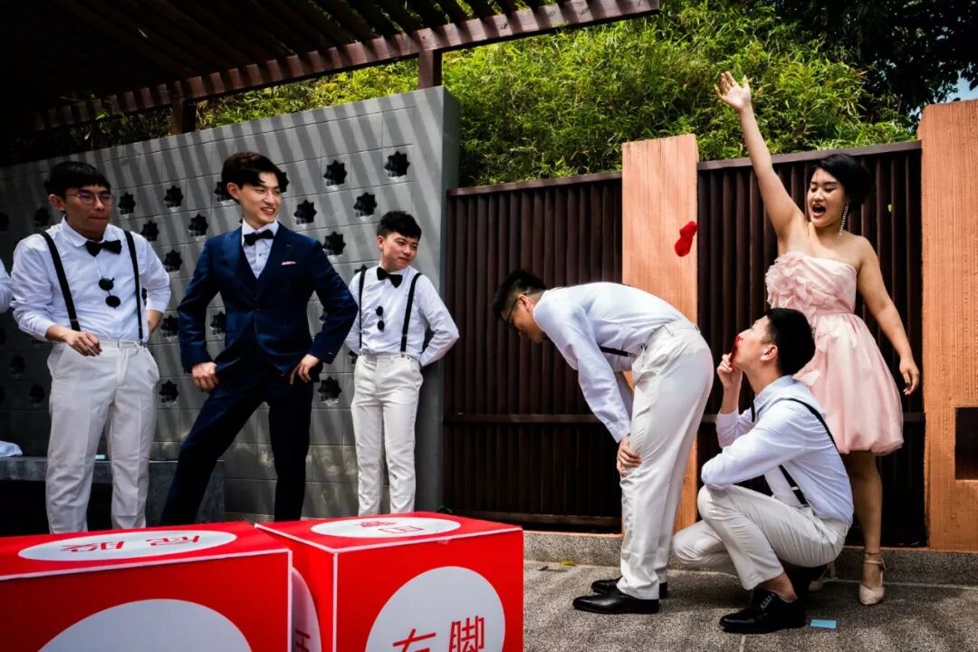 当然,婚礼上最经典的Shoe Game游戏也是一定要出现的。不过我们做了一点小小的改动,一只手拿着鞋子,另外一只手拿着我们小时候的照片。