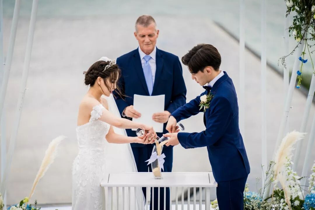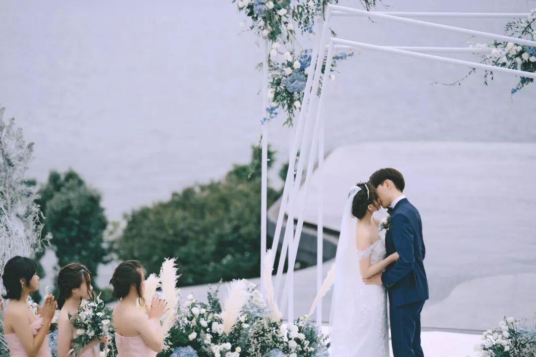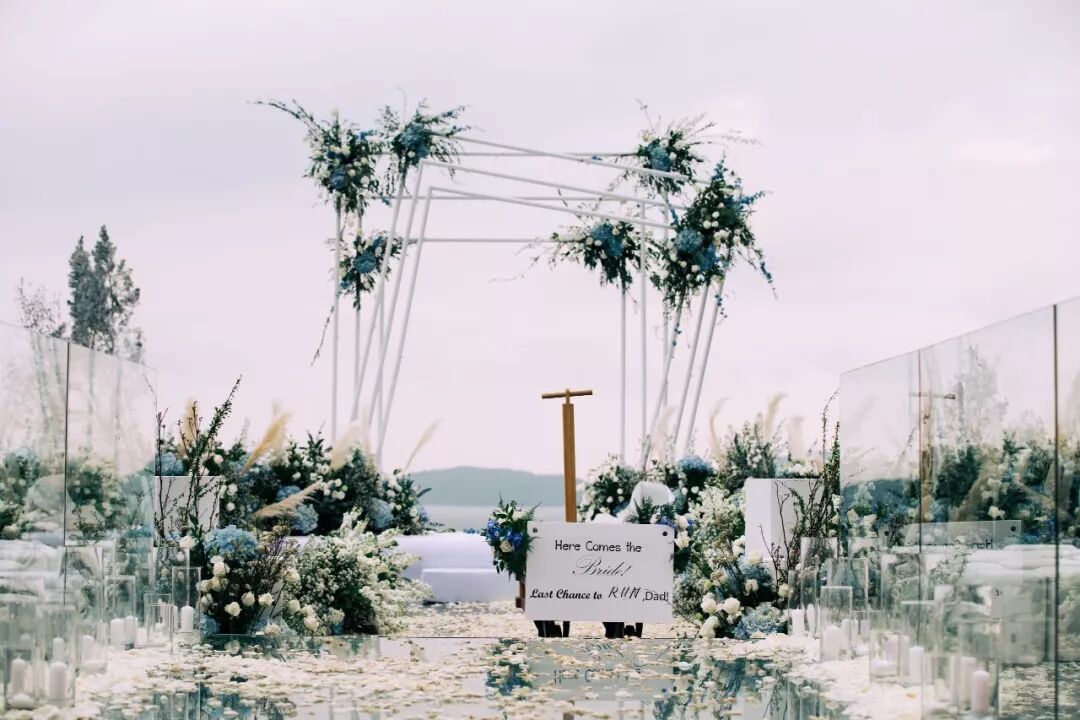 主仪式是新郎很喜欢的色系:蓝白绿,偏冷色调一些,面朝大海,显得格外清新脱俗。