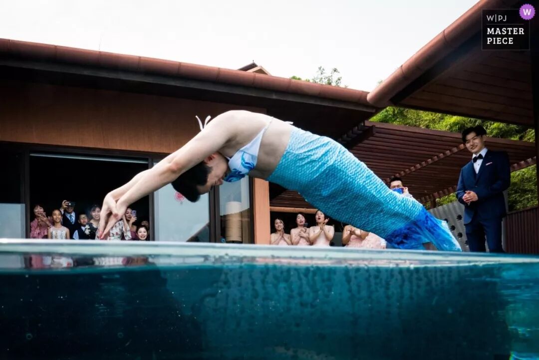 接亲游戏里比较有海岛特色的就是伴郎们穿着美人鱼泳装在泳池里找婚鞋。(这个真的是爆笑全场)