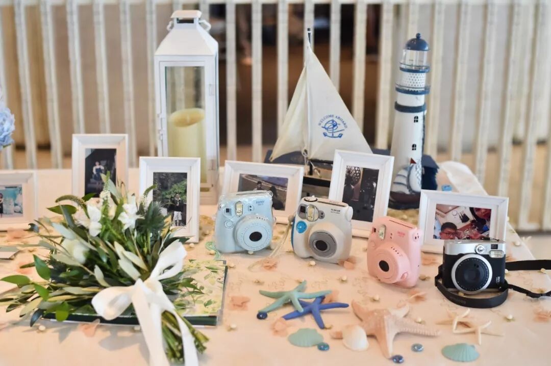 由于我们都喜欢简约而设计感强的东西,主背景是方形的框架结构堆叠,这样很好地保证了水台的通透性,而椅子我们也没有选择海岛婚礼常用的竹节椅,而是使用了很可爱的白色小方墩。