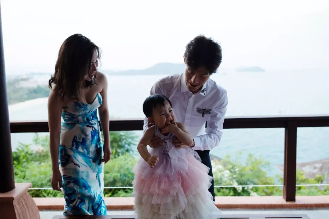 欢迎晚宴以轻松随意的基调为主,所以我选择了Pronovias的水墨画礼服,而新郎穿了很有海岛风情的Valentino的蜻蜓款白衬衫和小白鞋,我们的女儿穿了一个澳洲品牌(TUTU DU Monde)的纱纱裙,这个牌子真的很适合花童。