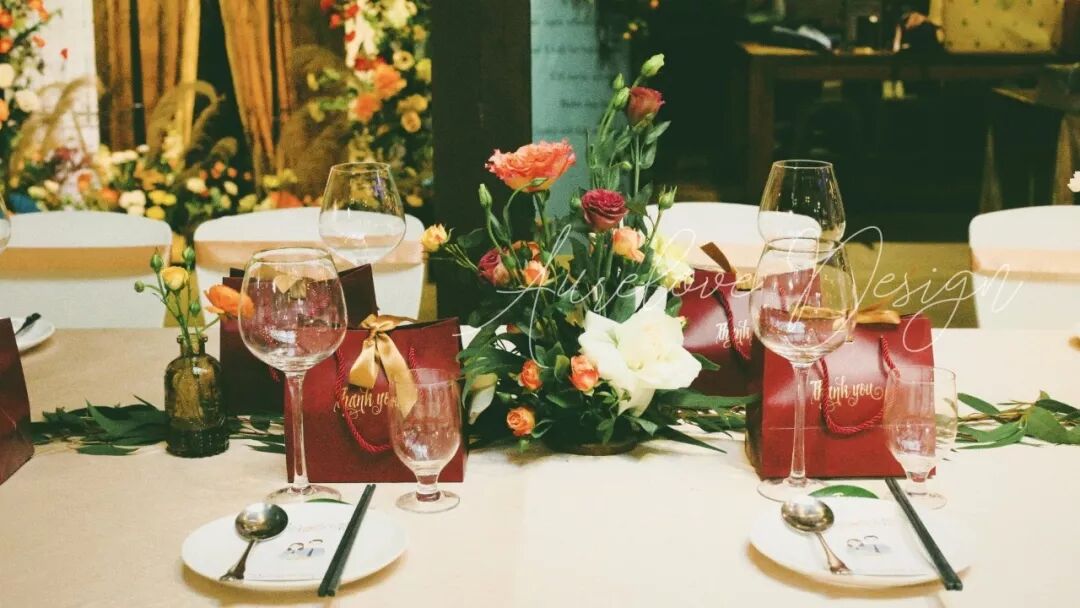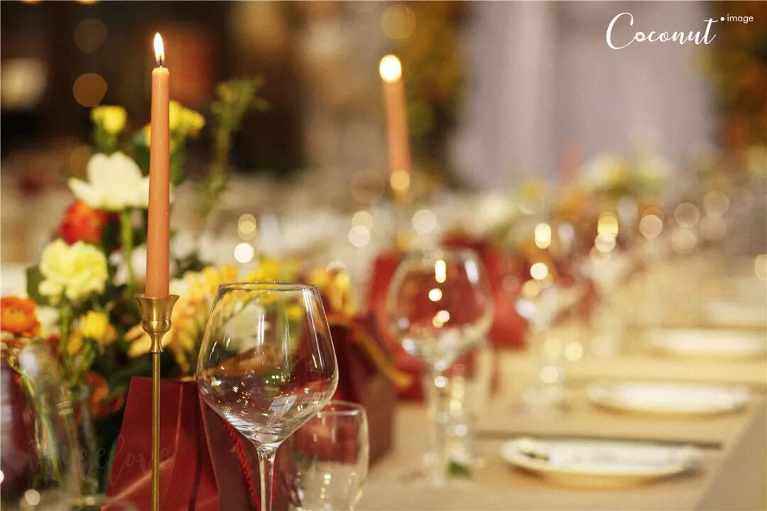 桌花和蜡烛交错搭配加上整齐摆放的酒杯餐碟,婚礼的品质设计诚意让婚礼来宾体验赞不绝口。