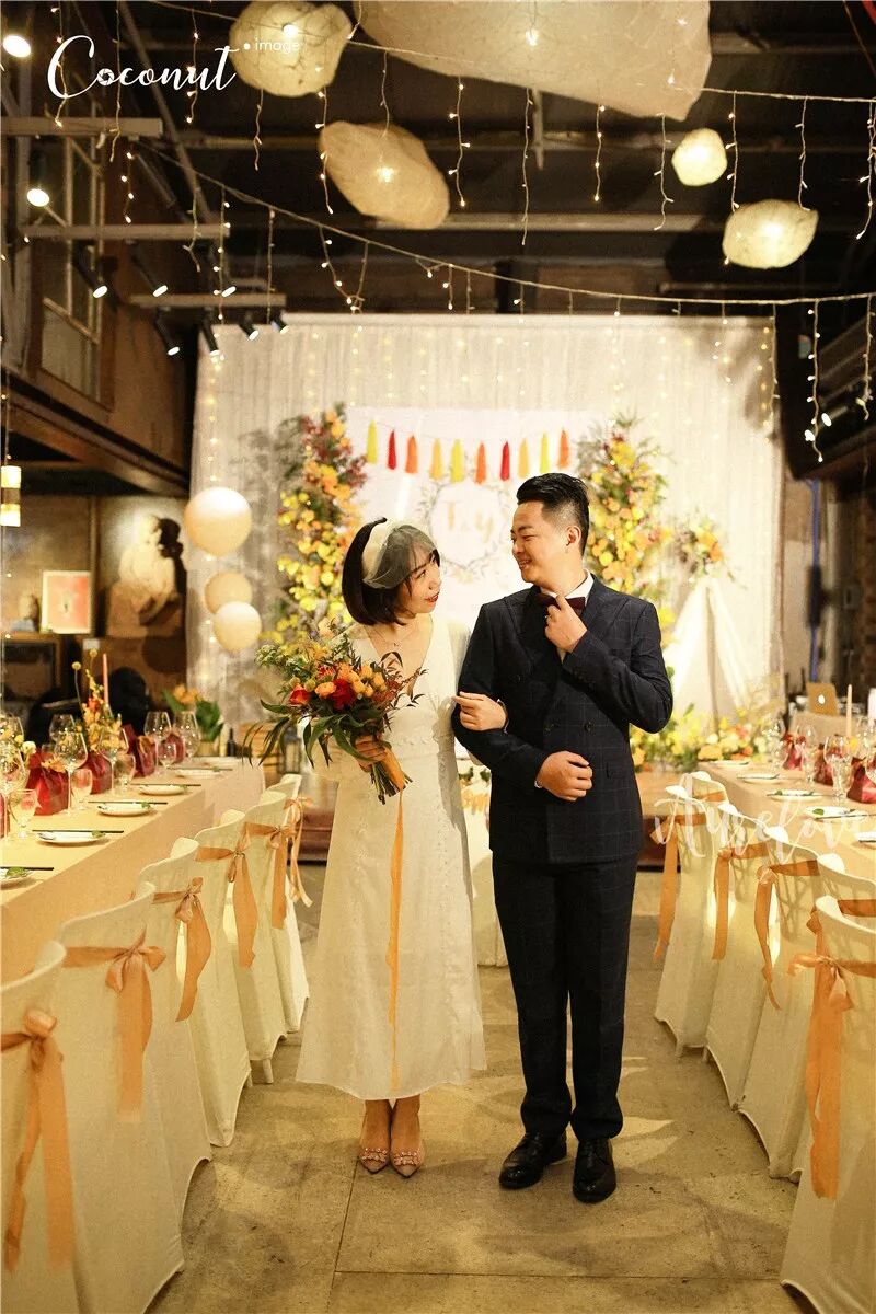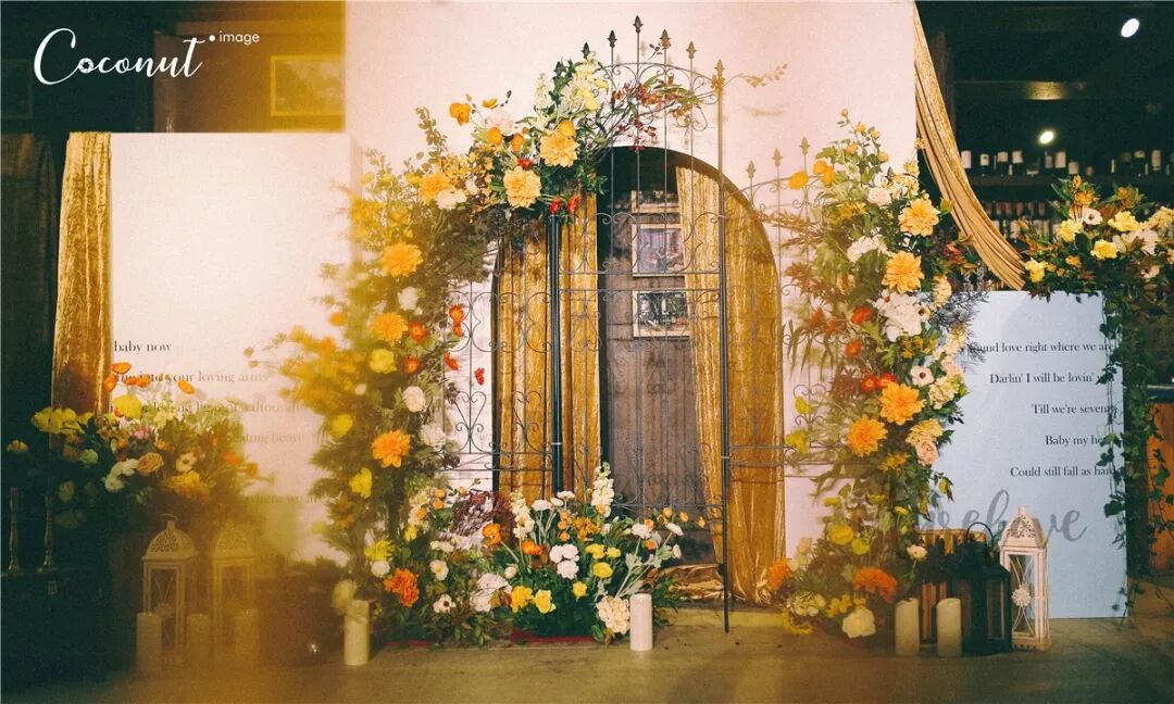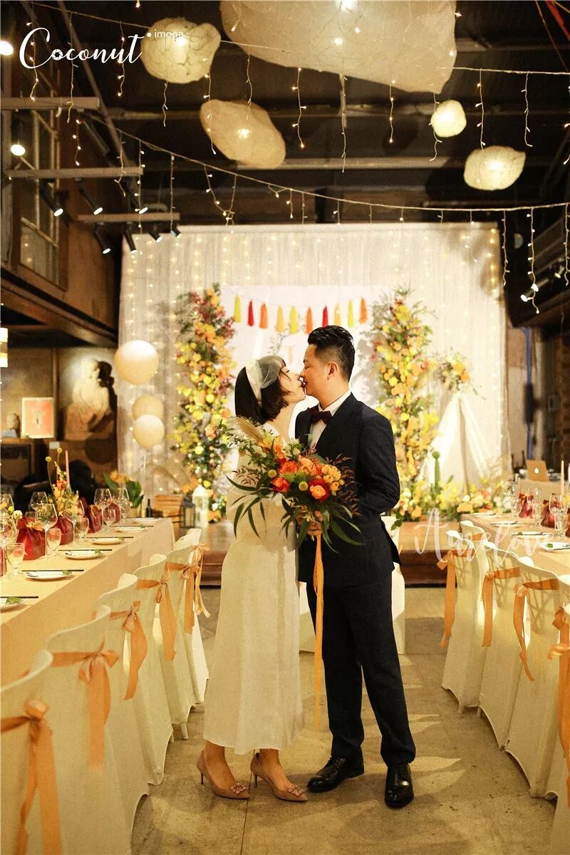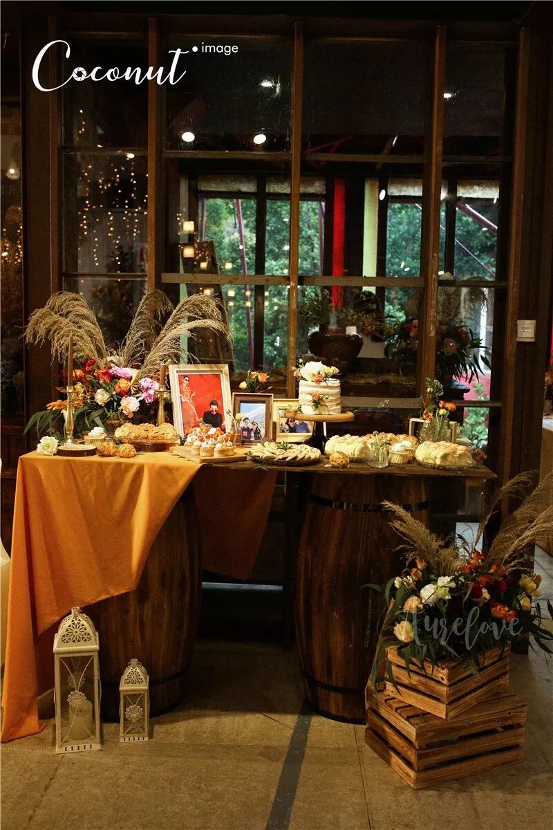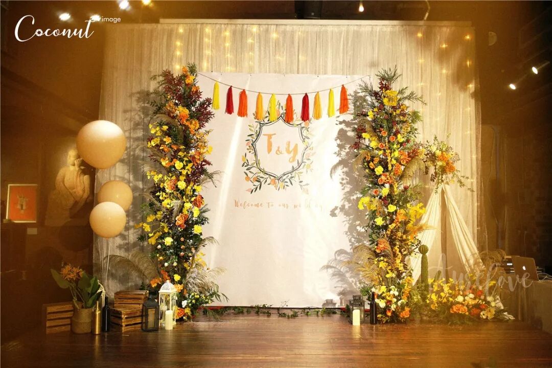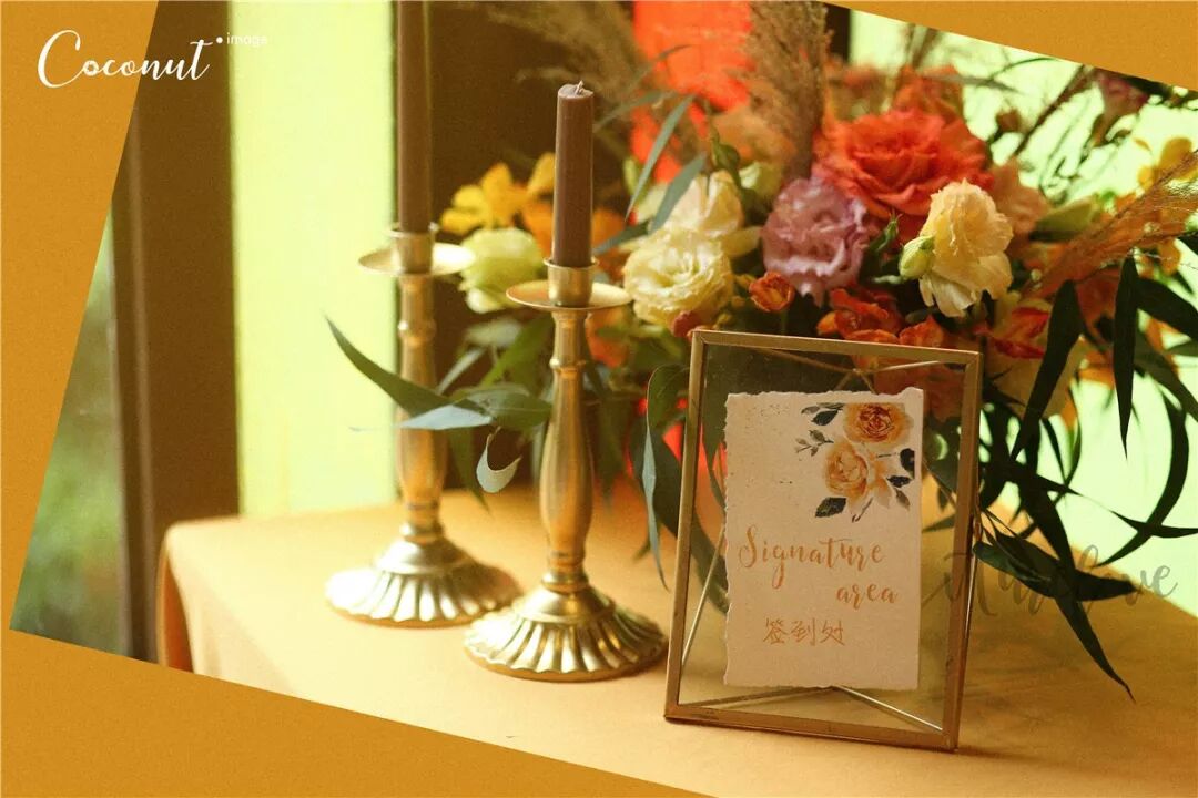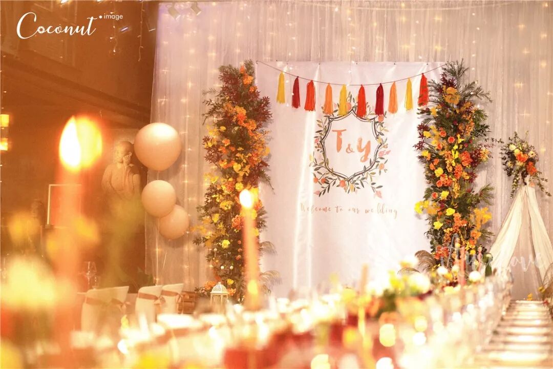 婚礼的风格是秋天的色调,象征秋色的枫叶、银杏叶、芦苇草等这些元素是必不可少的。黄色、橘色、橙色、红色都是婚礼的重要角色。