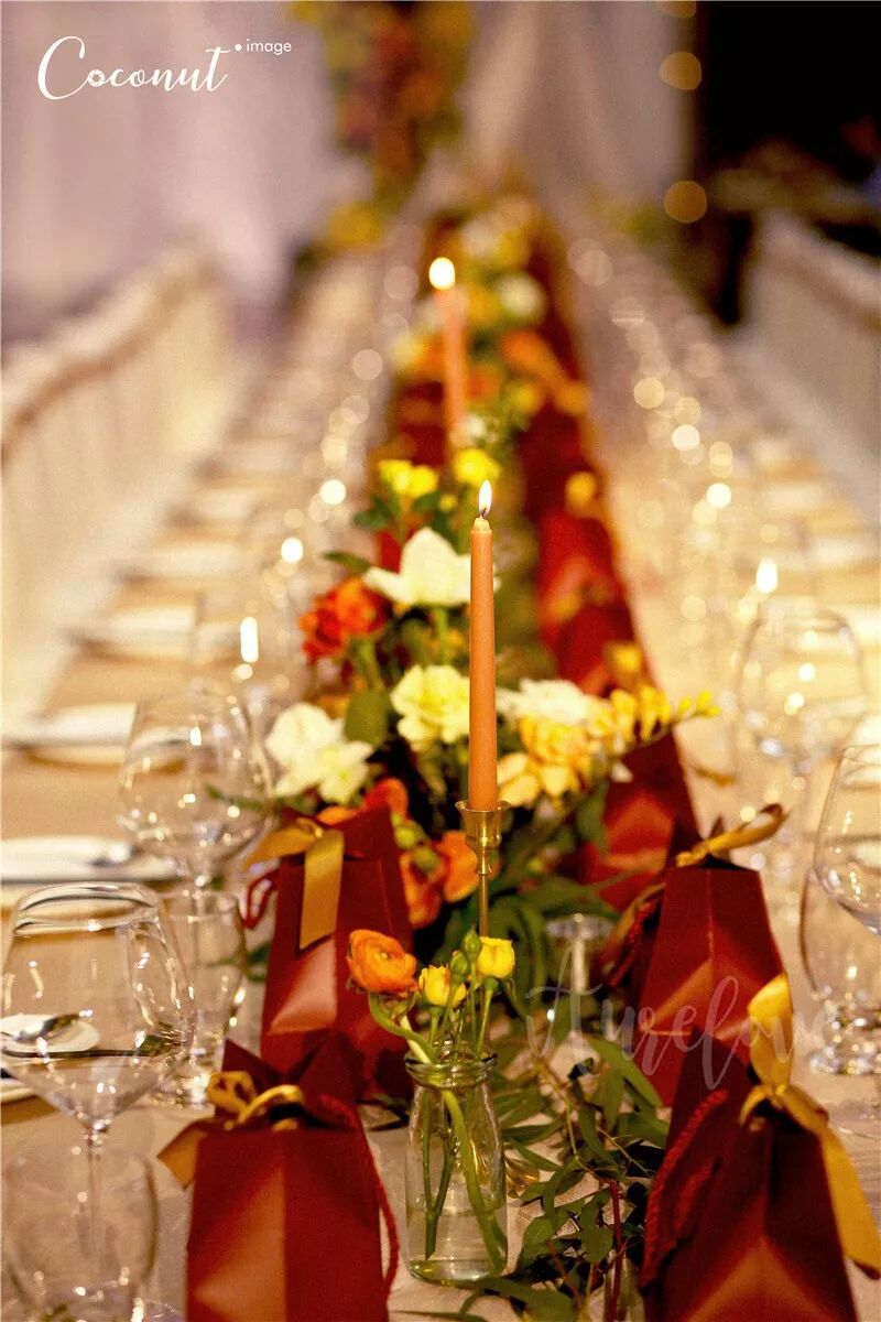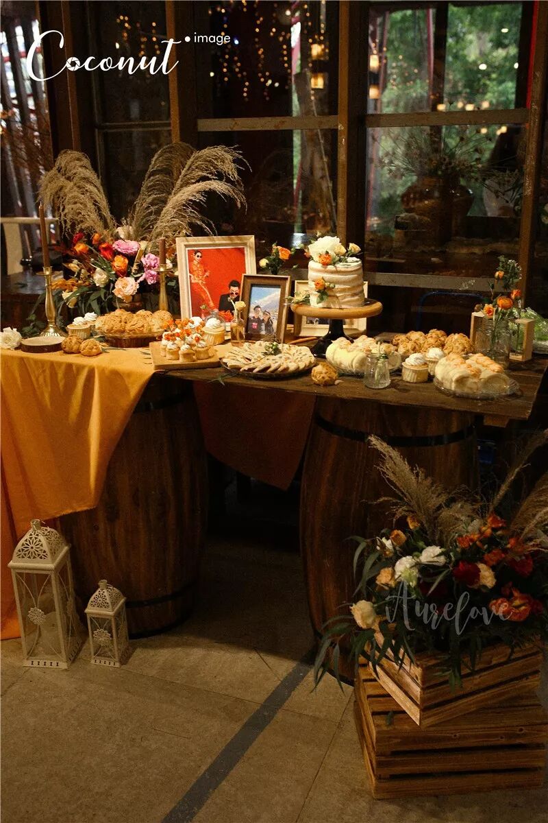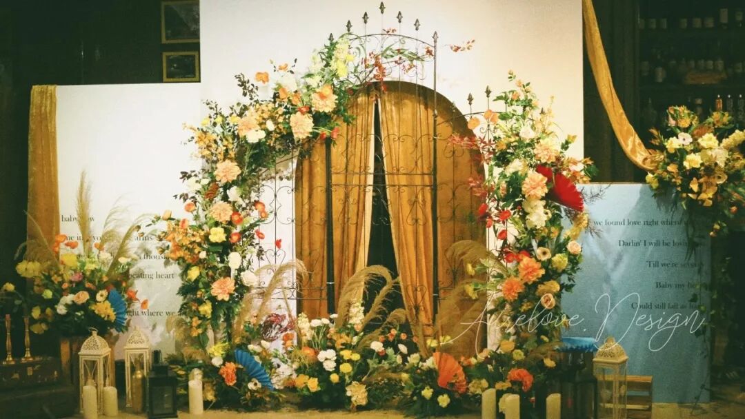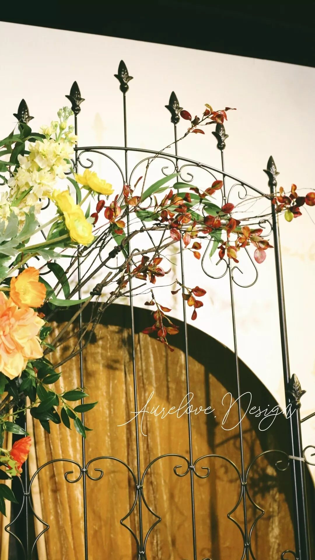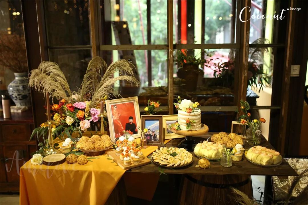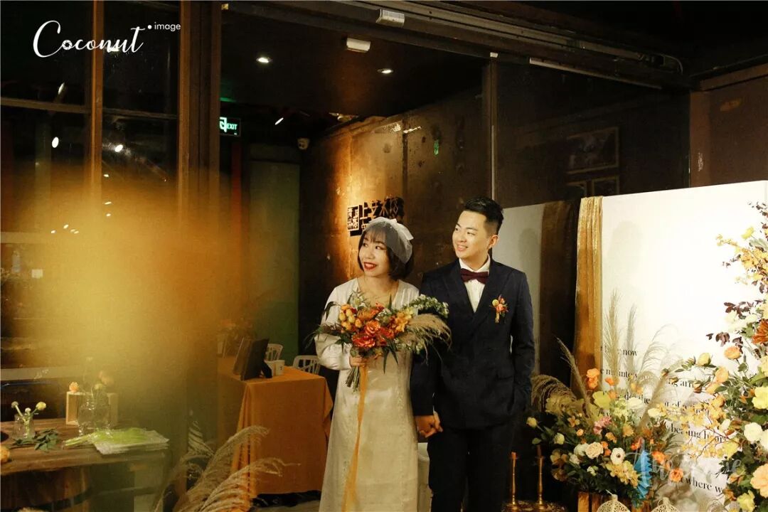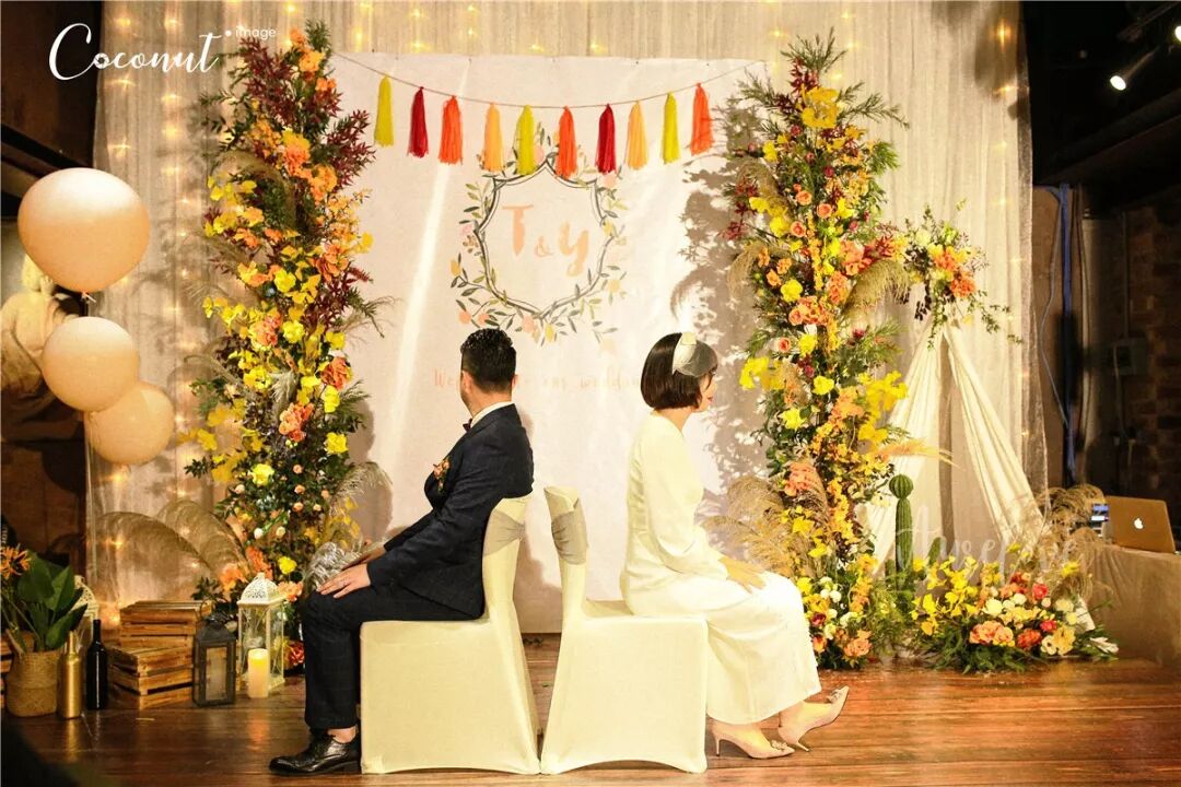 婚礼的风格是秋天的色调,象征秋色的枫叶、银杏叶、芦苇草等这些元素是必不可少的。黄色、橘色、橙色、红色都是婚礼的重要角色。