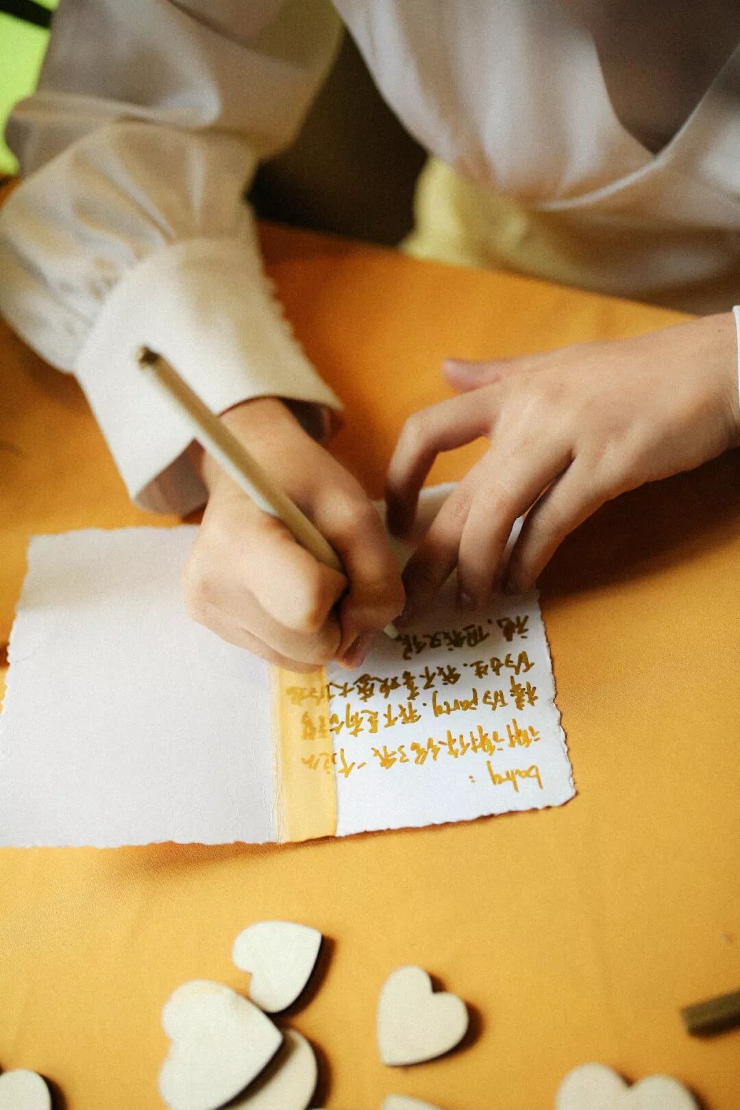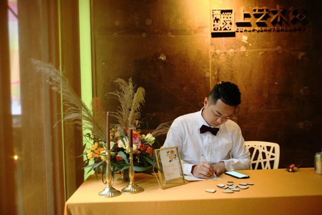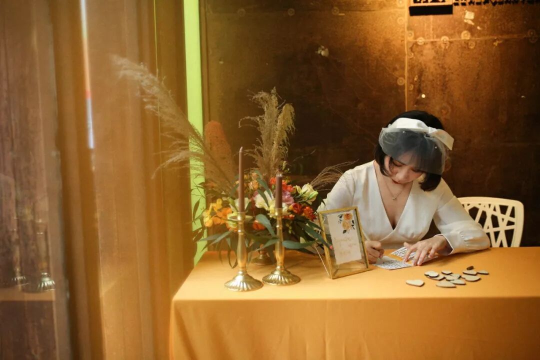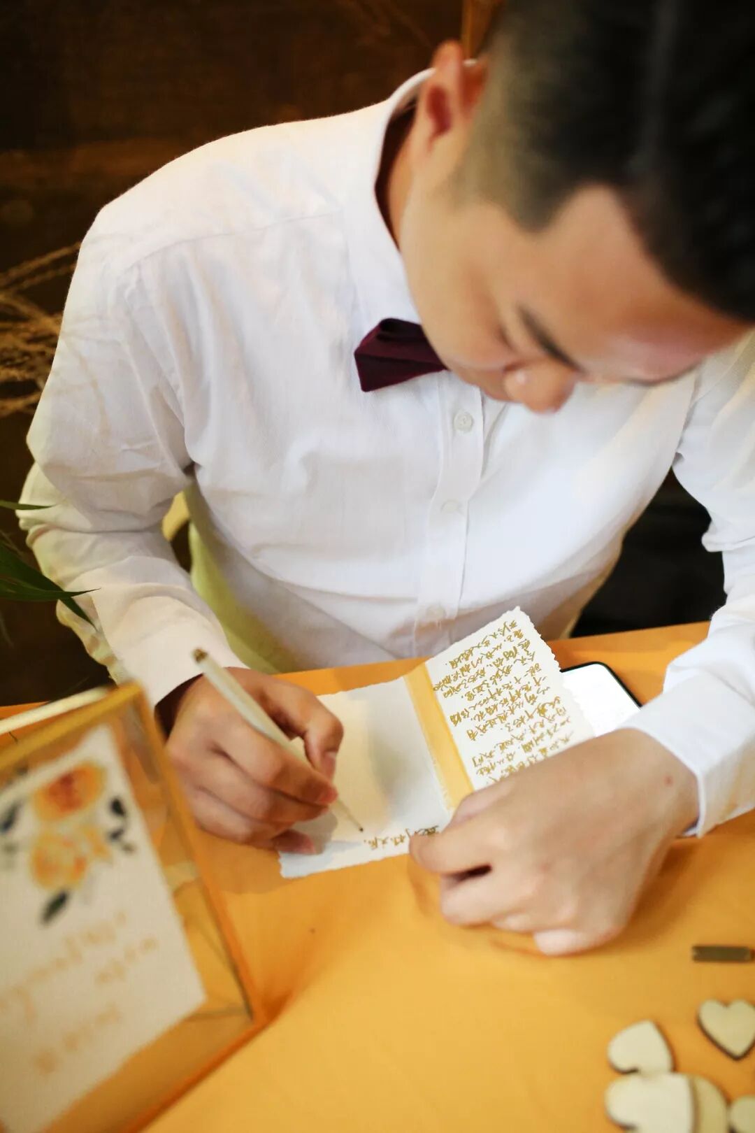 婚礼开始之前,新娘在空闲的时间里写婚礼仪式环节对新郎的告白情书。