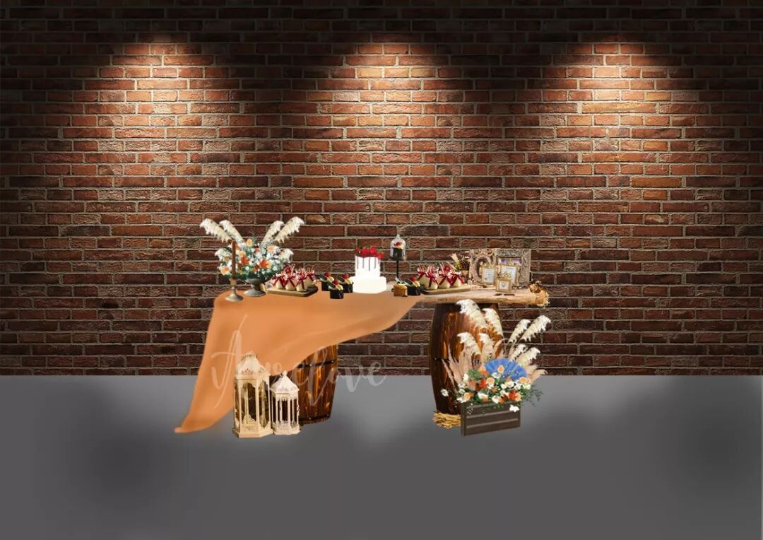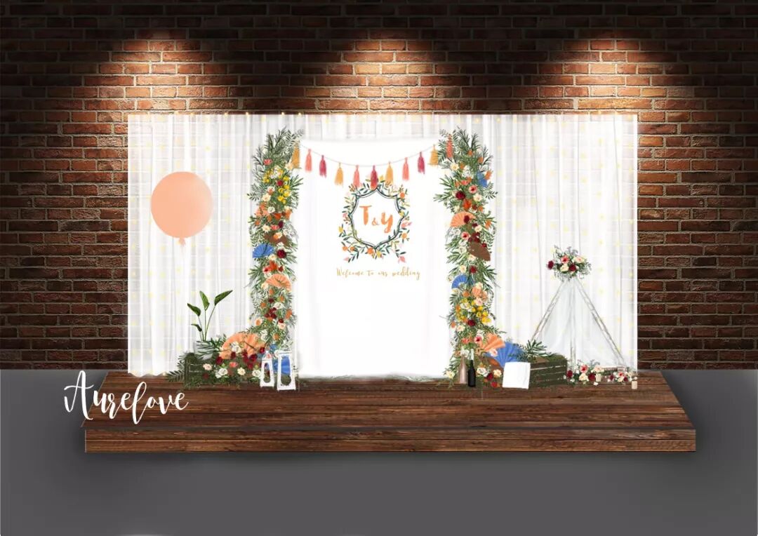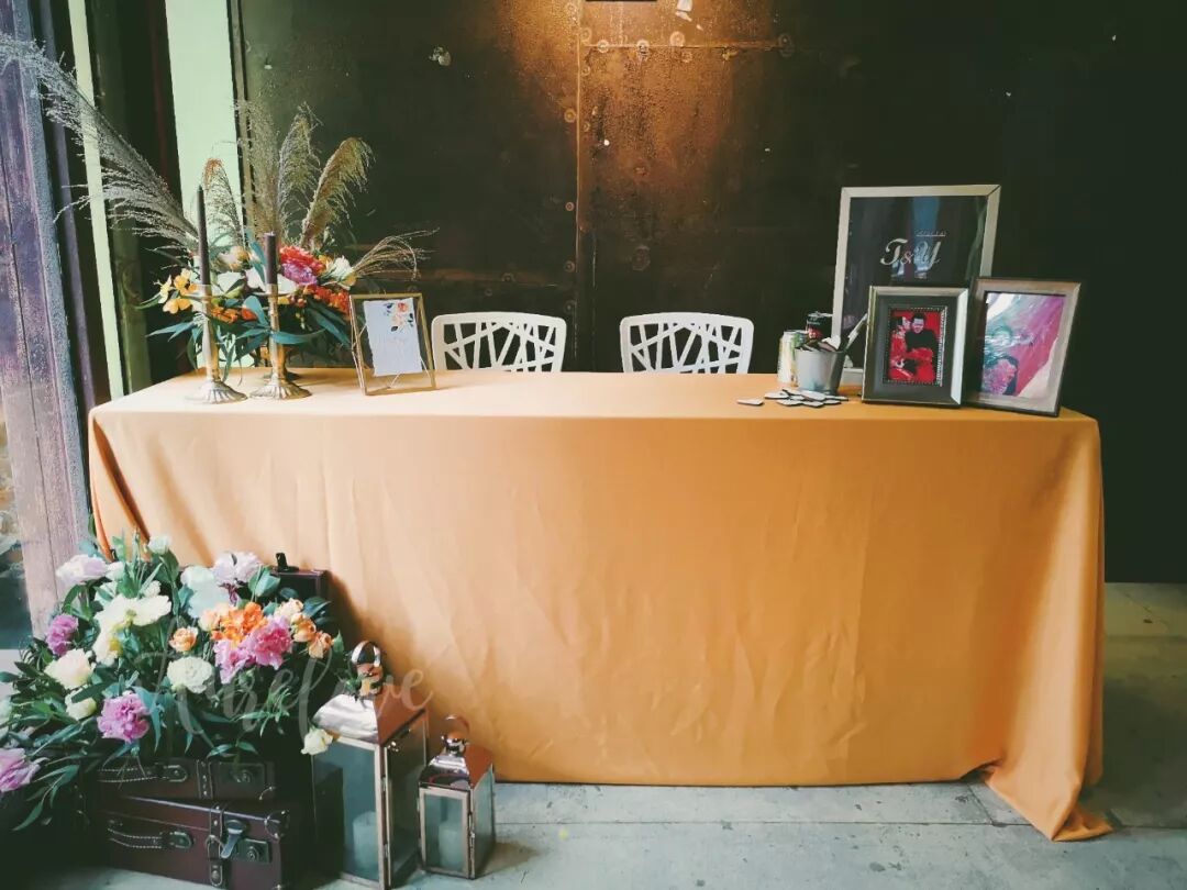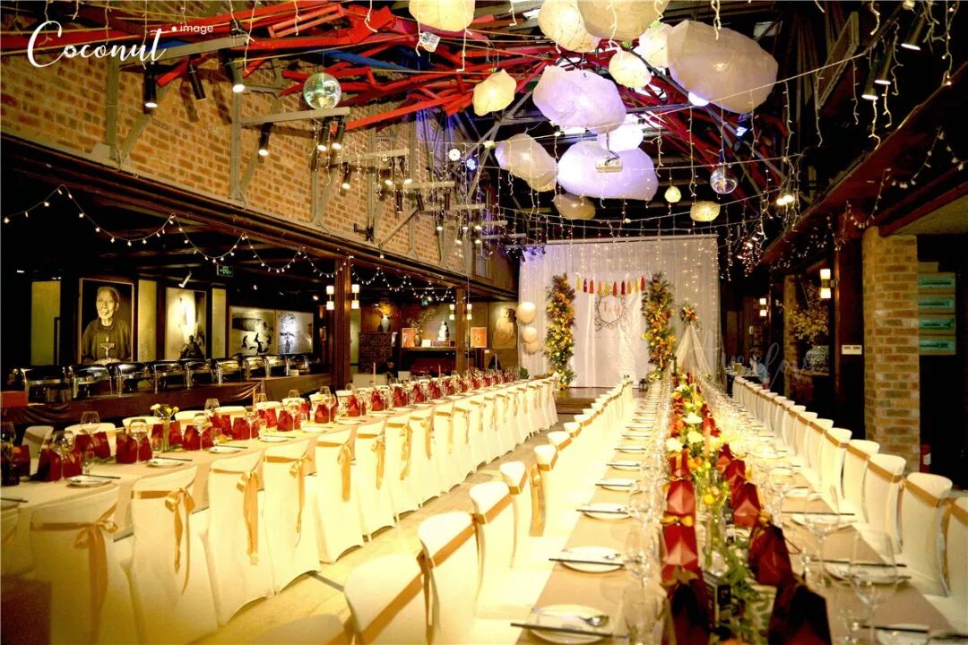 小型婚礼长条餐桌和舞台形成开口型时,中间留有足够宽的走道也是可以当婚礼的走道路引的。