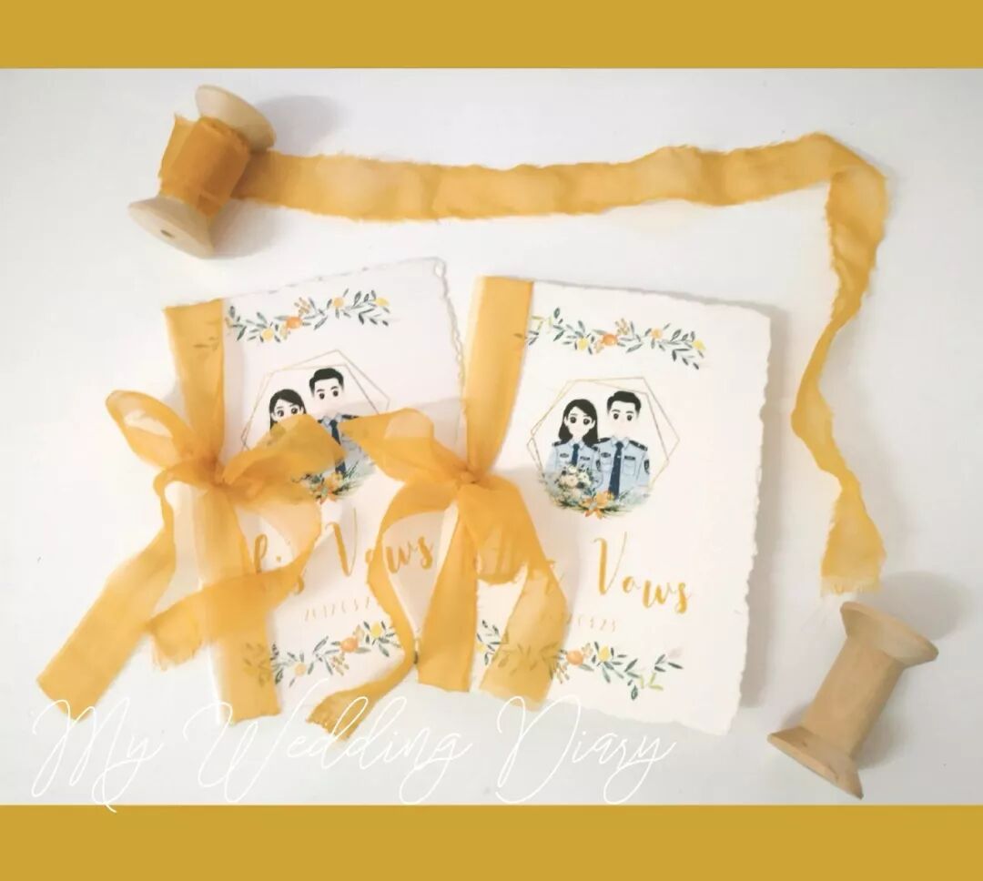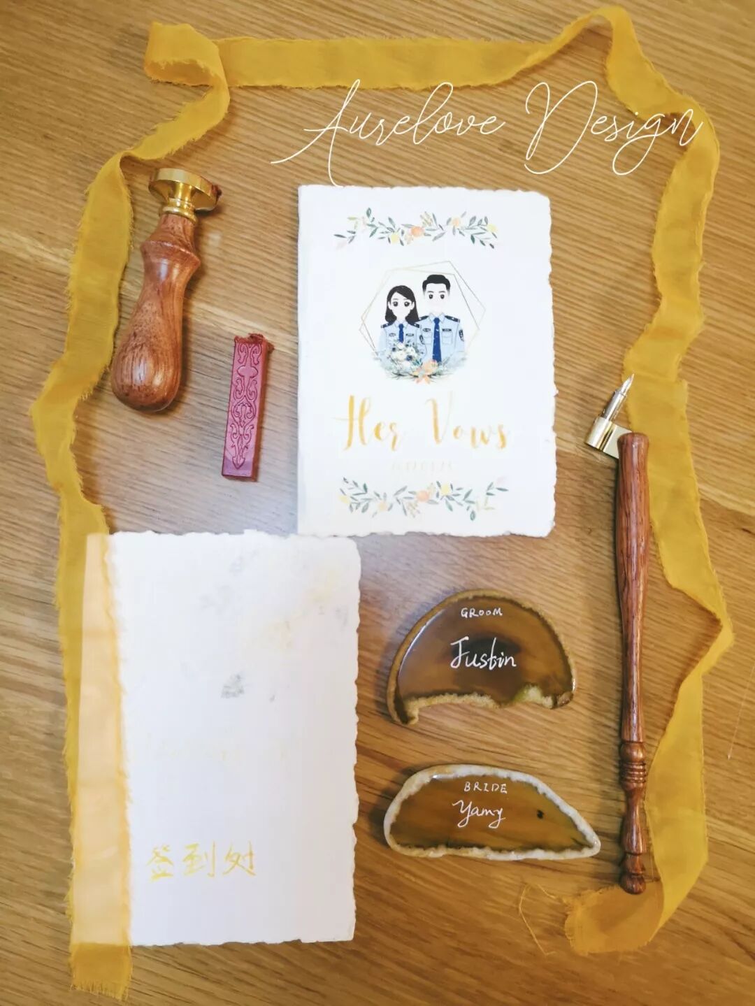 纯手工制作的毛边卡纸,加上手绘或者印刷技术做成的主题婚礼宣誓告白书。加上纯手工手撕毛边丝带,精美高级感满分。