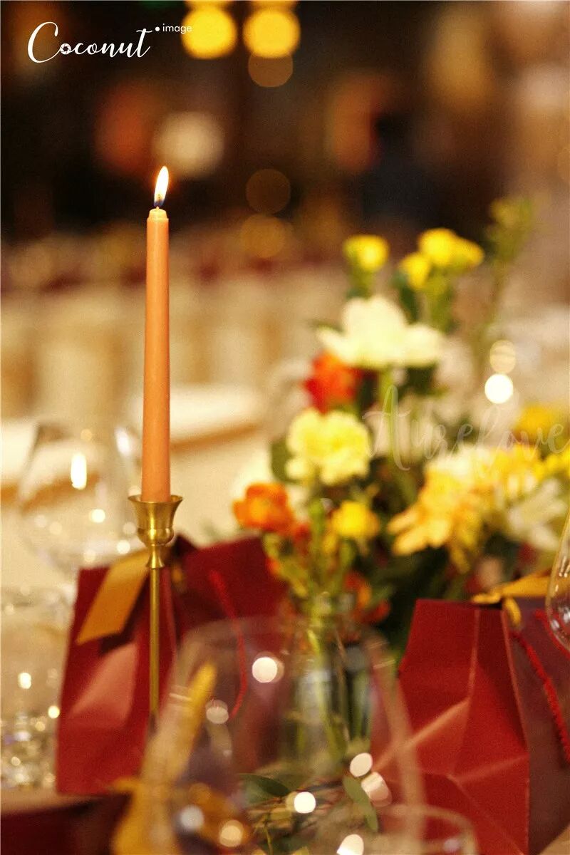 婚礼餐桌摆放精美的桌花之外还搭配婚礼色调的蜡烛,让整场婚礼的设计品质更有质感,当点燃蜡烛的时候,会让来宾就餐享受一种高级待遇和视觉的体验。