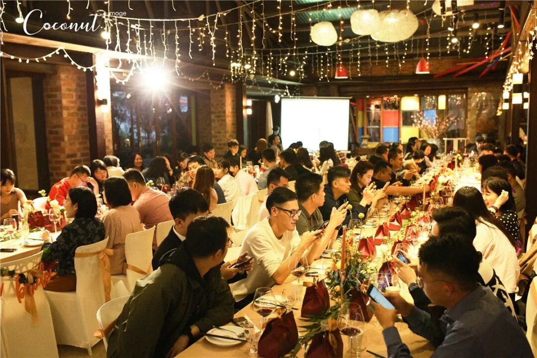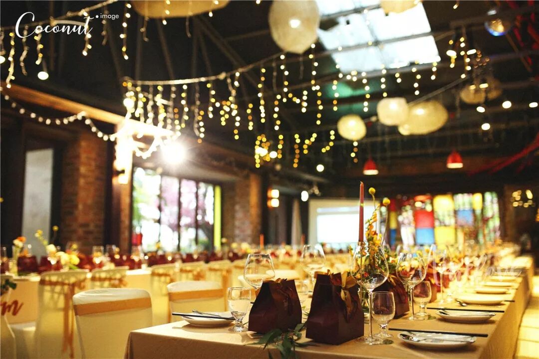 婚礼的餐桌蜡烛点燃,加上灯光架的灯光还有星星灯的闪烁,婚礼既满满的秋天气息还有温暖的气氛。