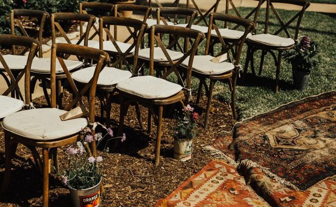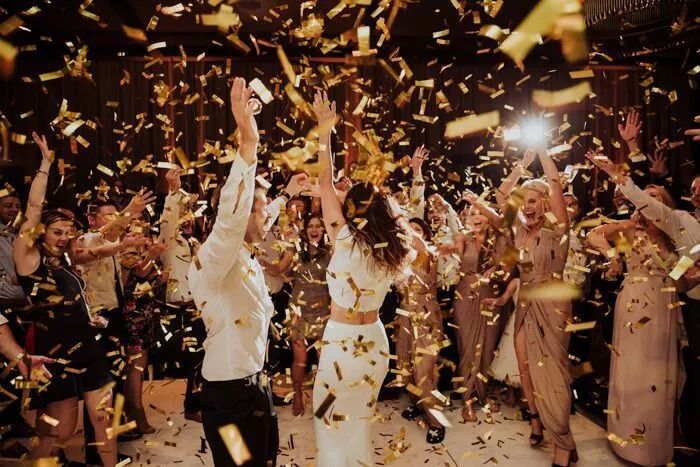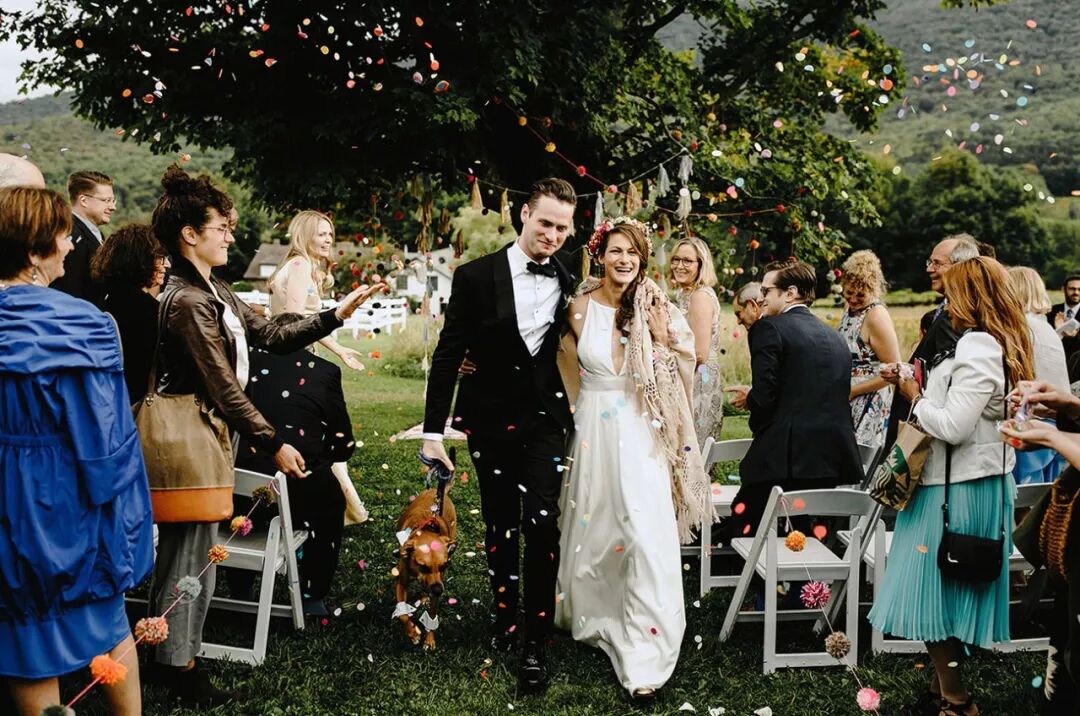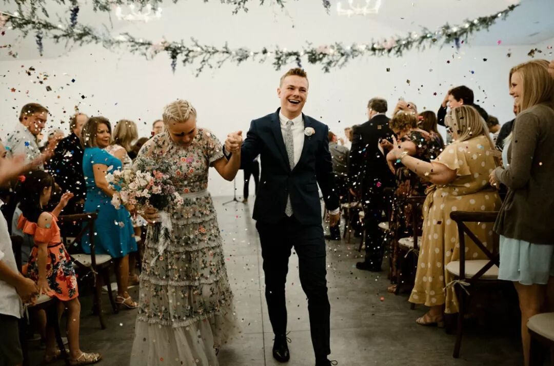 可以事先在通道两侧放置收纳篮,里面可以放上花瓣、彩纸、或金箔碎片,然后在退场之前邀请大家站在两侧,等你们走过的时候就可以尽情挥洒啦