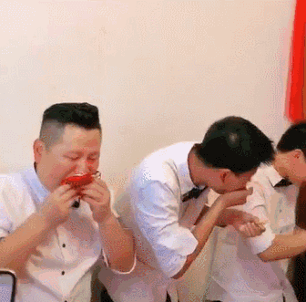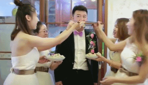 有时,伴郎也会体验到伴娘们的VIP用餐服务,只不过,是四个人同时喂那种...