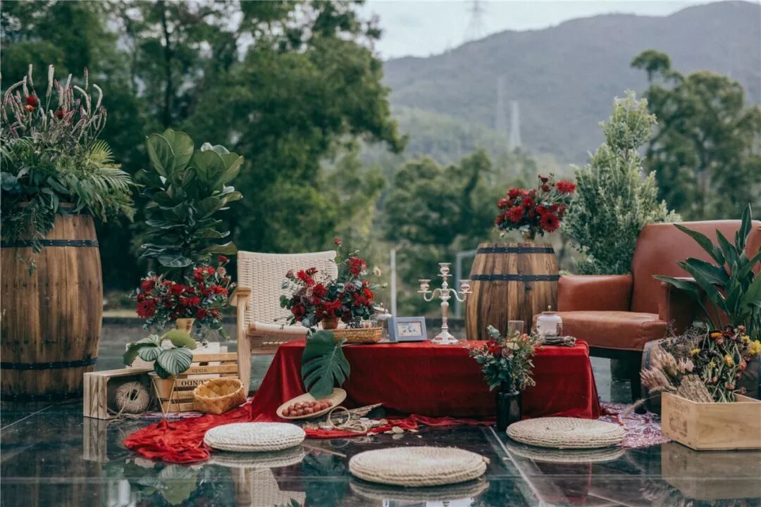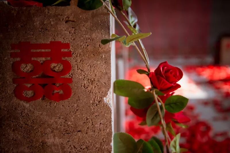 传统喜庆的大红色元素搭配着青砖,有着别样的美感,长燃的烛火、绽放的玫瑰花瓣,布置虽然简单,但是保留了传统中式婚礼的喜气,很赞呀~~