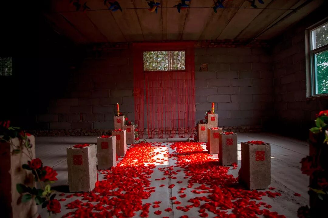婚礼场地是一个未装修的普通砖瓦房二楼,本来是用来放杂物的。暗淡的水泥色,飞扬的灰尘甚至还有填填补补的红砖。