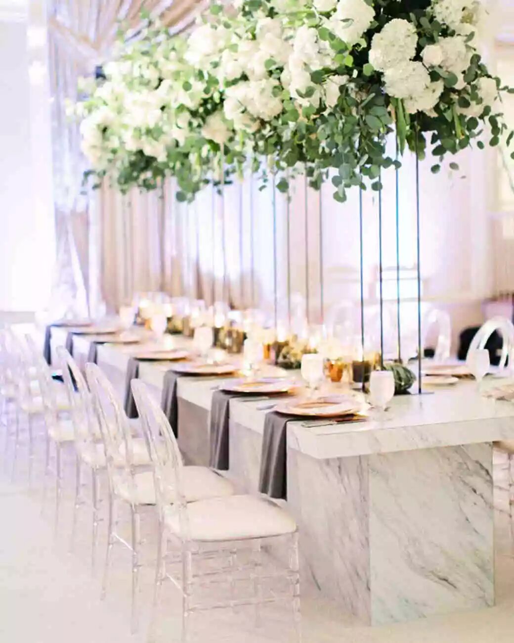 以非传统方式使用的经典元素也可以让你的一天感觉到非常现代。我们使用这些定制的大理石桌子,没有亚麻布,给空间带来现代,干净的外观,非常漂亮。