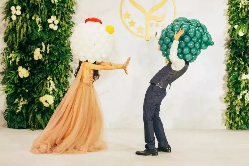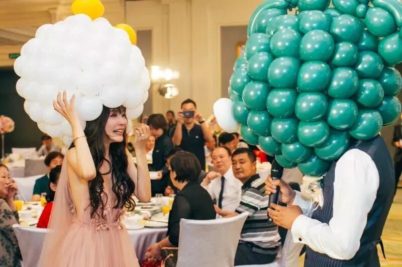 最后,也可以像新娘闫闪闪这样,戴着自制的小怪兽气球头套,边唱歌,边上演一出奥特曼打怪兽,逗得现场一片欢笑。