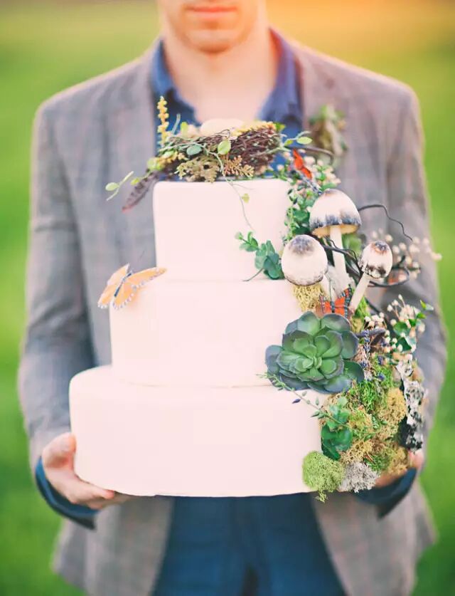 蘑菇的点缀,不失庄重,有平添多了几分俏皮。蘑菇搭配上几片叶子几朵小花,森系的风格铺面而来。