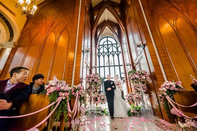 新娘穿高跟鞋、拖着长长的婚纱,新郎要照顾着脚步放慢一些,可以帮着提一下裙角,淡定缓缓走向仪式区。