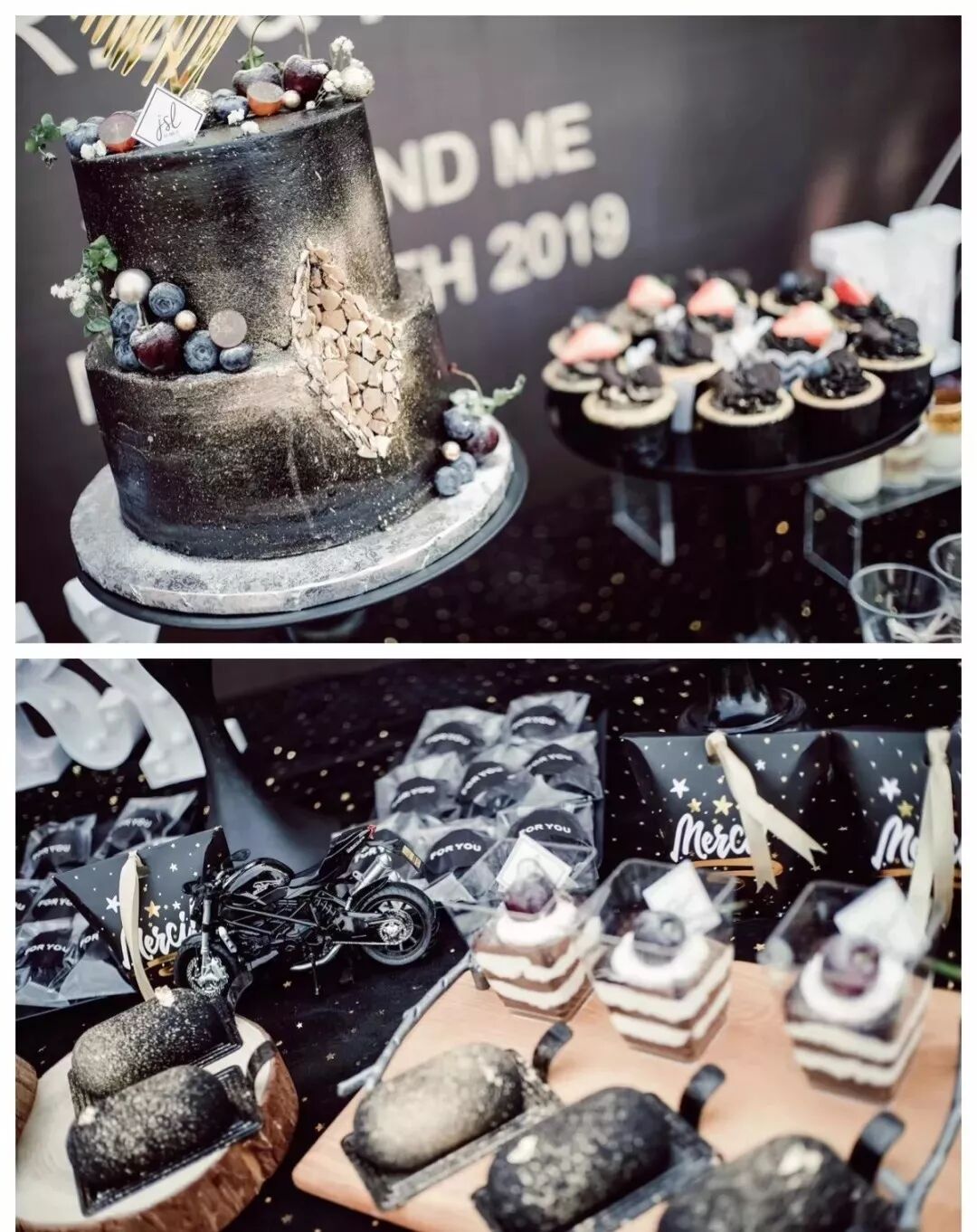 婚礼的甜品区非常精致,神秘又个性,完全符合我们的性格。老板还很贴心的放了一辆摩托车,甜甜的空间里充满了魔力~