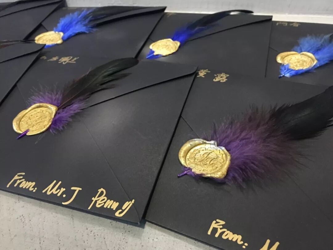 请帖完成后的样子很惊艳,黑色打底,金色字样点缀,还用了羽毛和火漆的元素,质感满满。