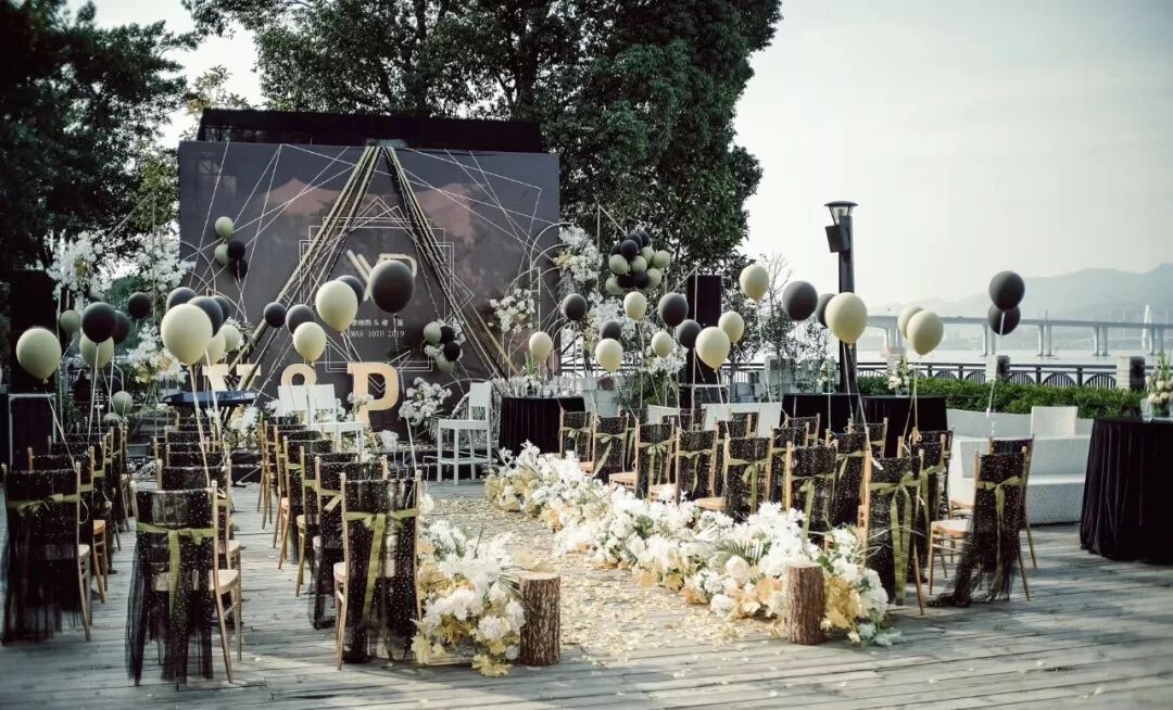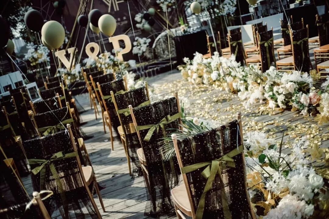 我选择黑金色作为整场婚礼的基调色,仪式背景是简洁的KT板加了些线条元素,整体婚礼布置简洁而大气。